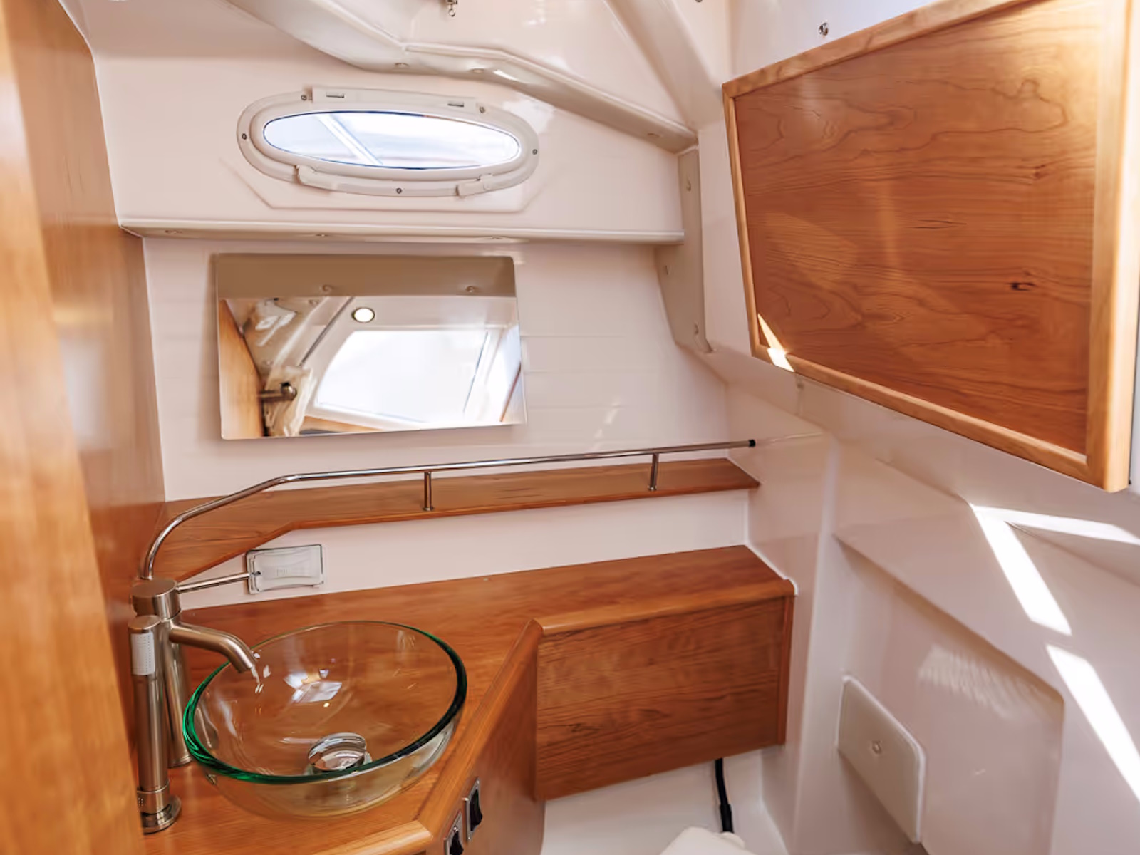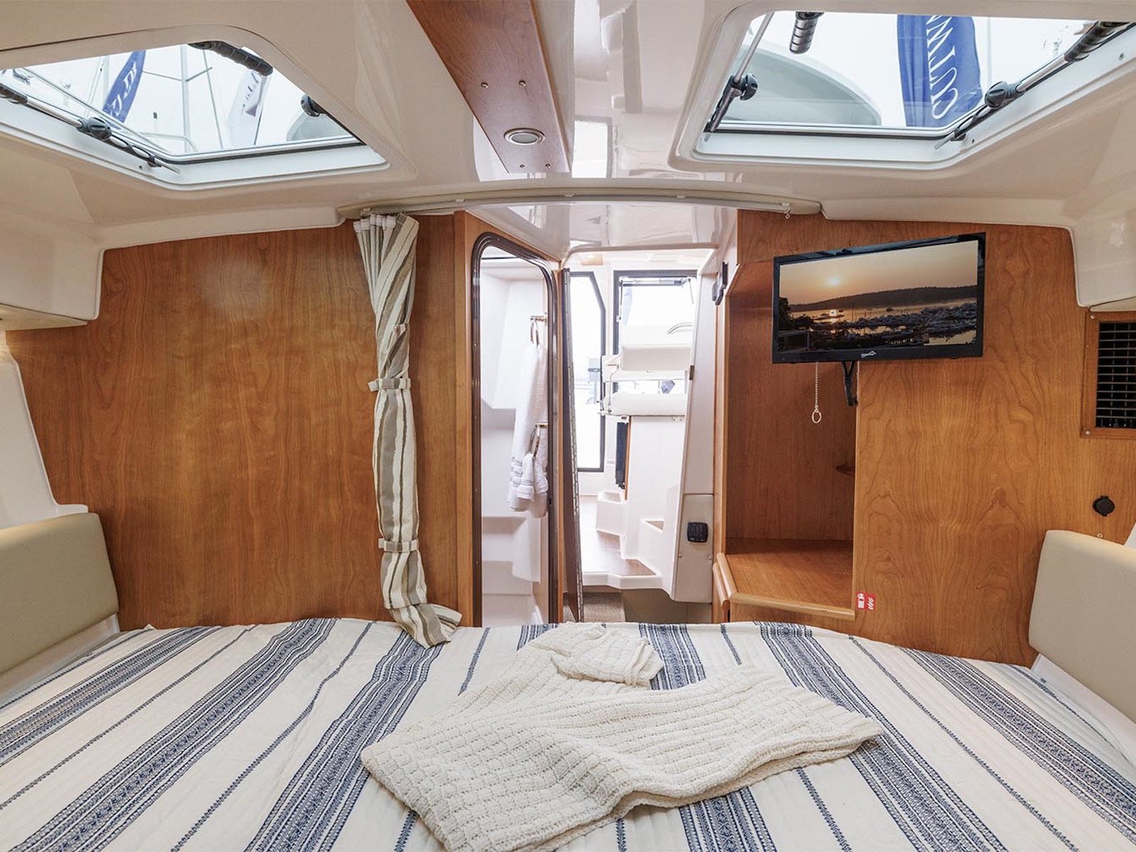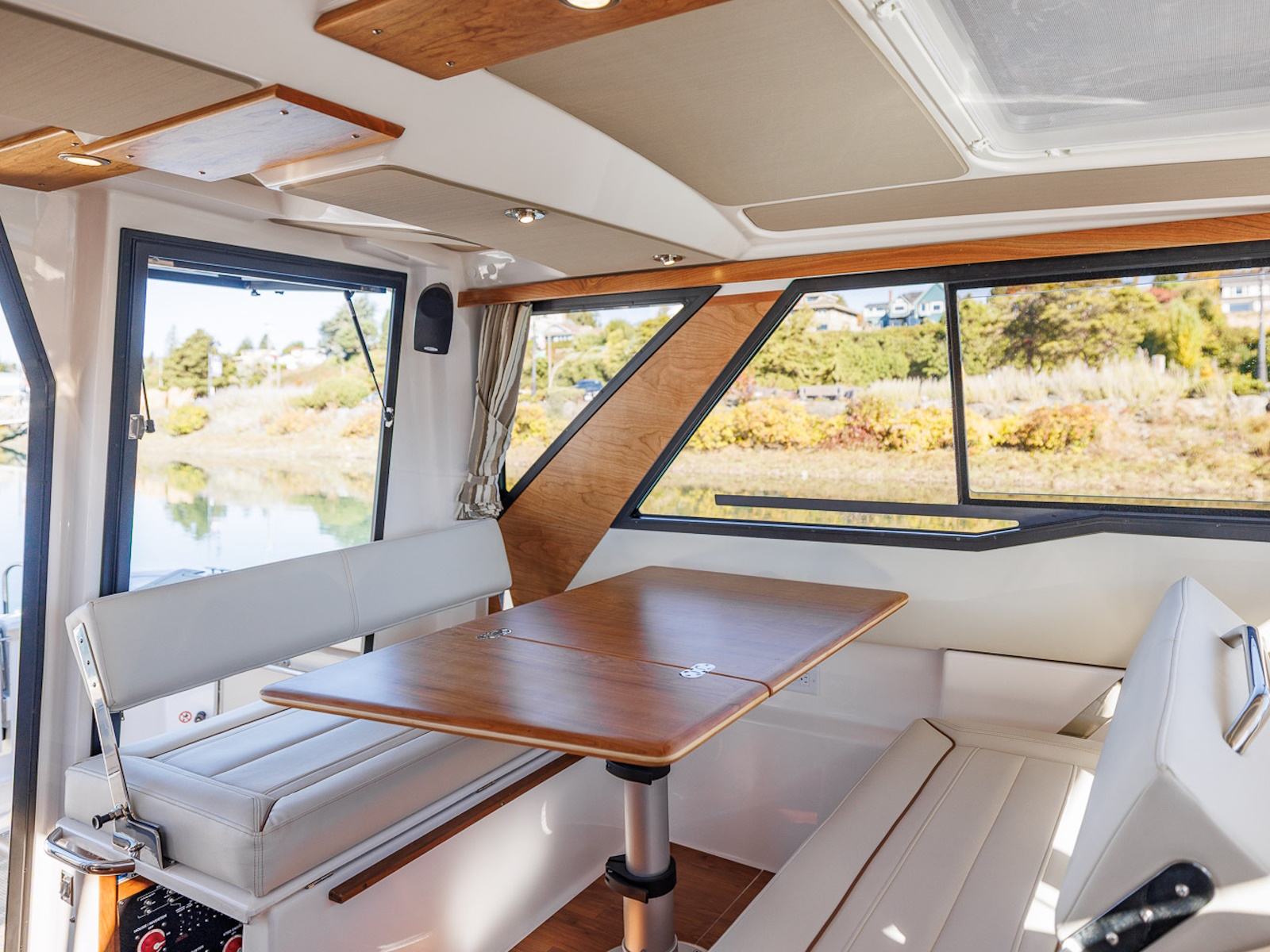 You’ll remain comfortable in any weather with the climate-controlled interior featuring sliding windows and opening portlights. Separate accommodations for six include a forward stateroom, convertible dinette, spacious mid-berth and a private head with shower.