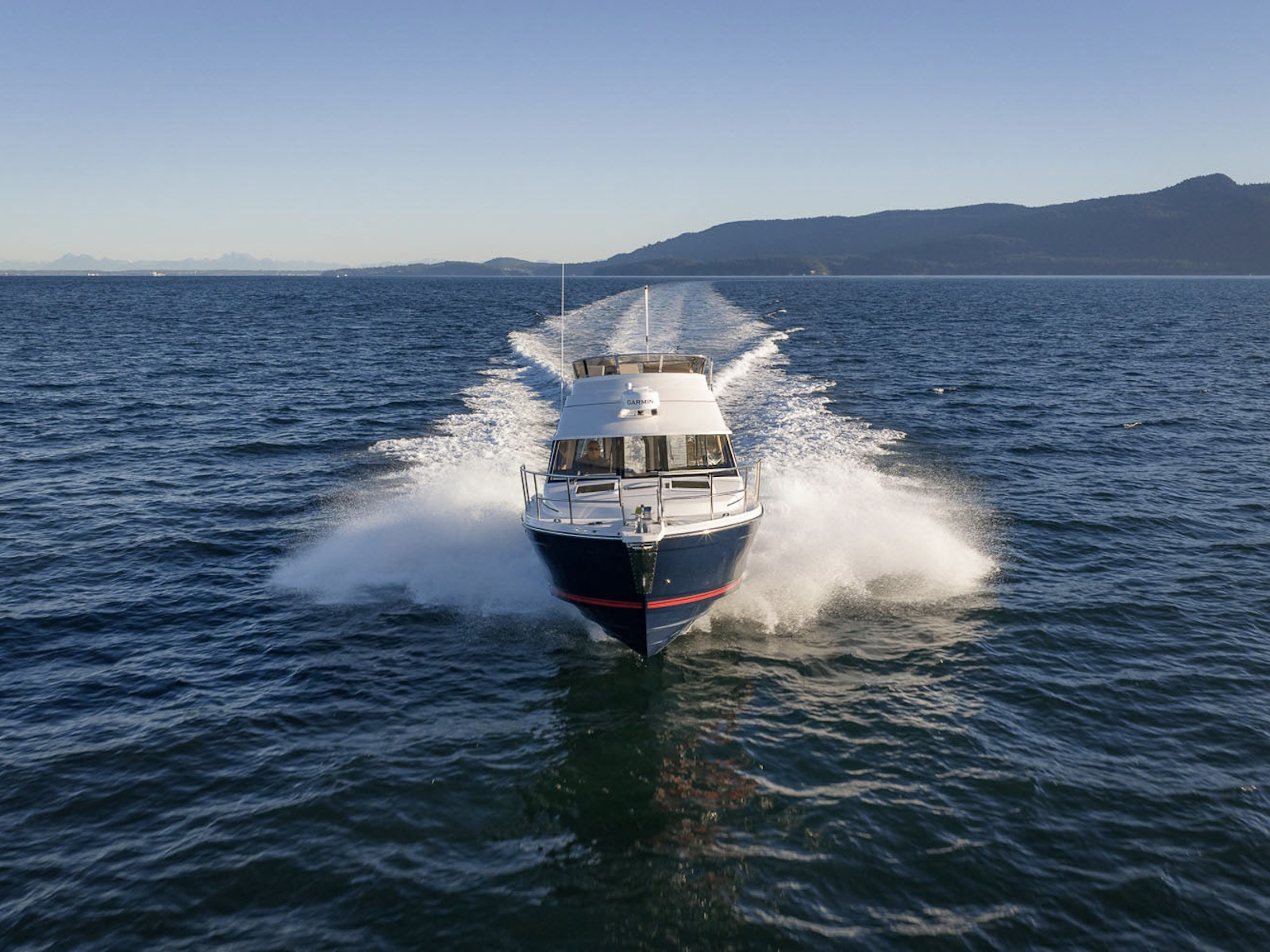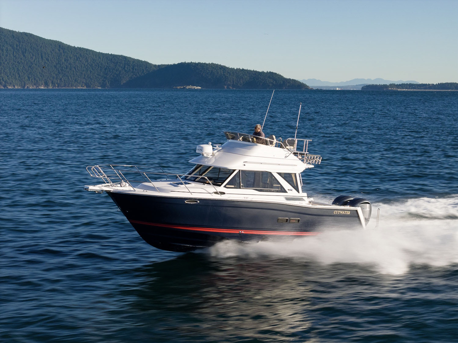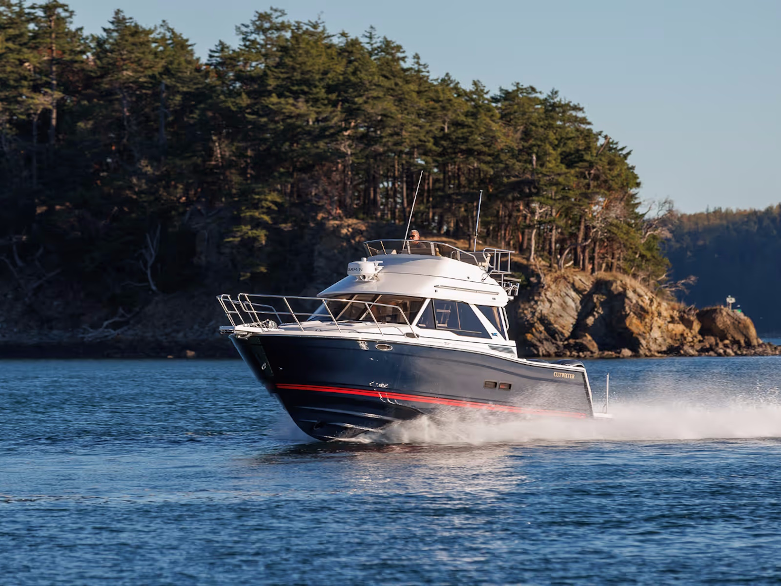You’ll remain comfortable in any weather with the climate-controlled interior featuring sliding windows and opening portlights. Separate accommodations for six include a forward stateroom, convertible dinette, spacious mid-berth and a private head with shower.
