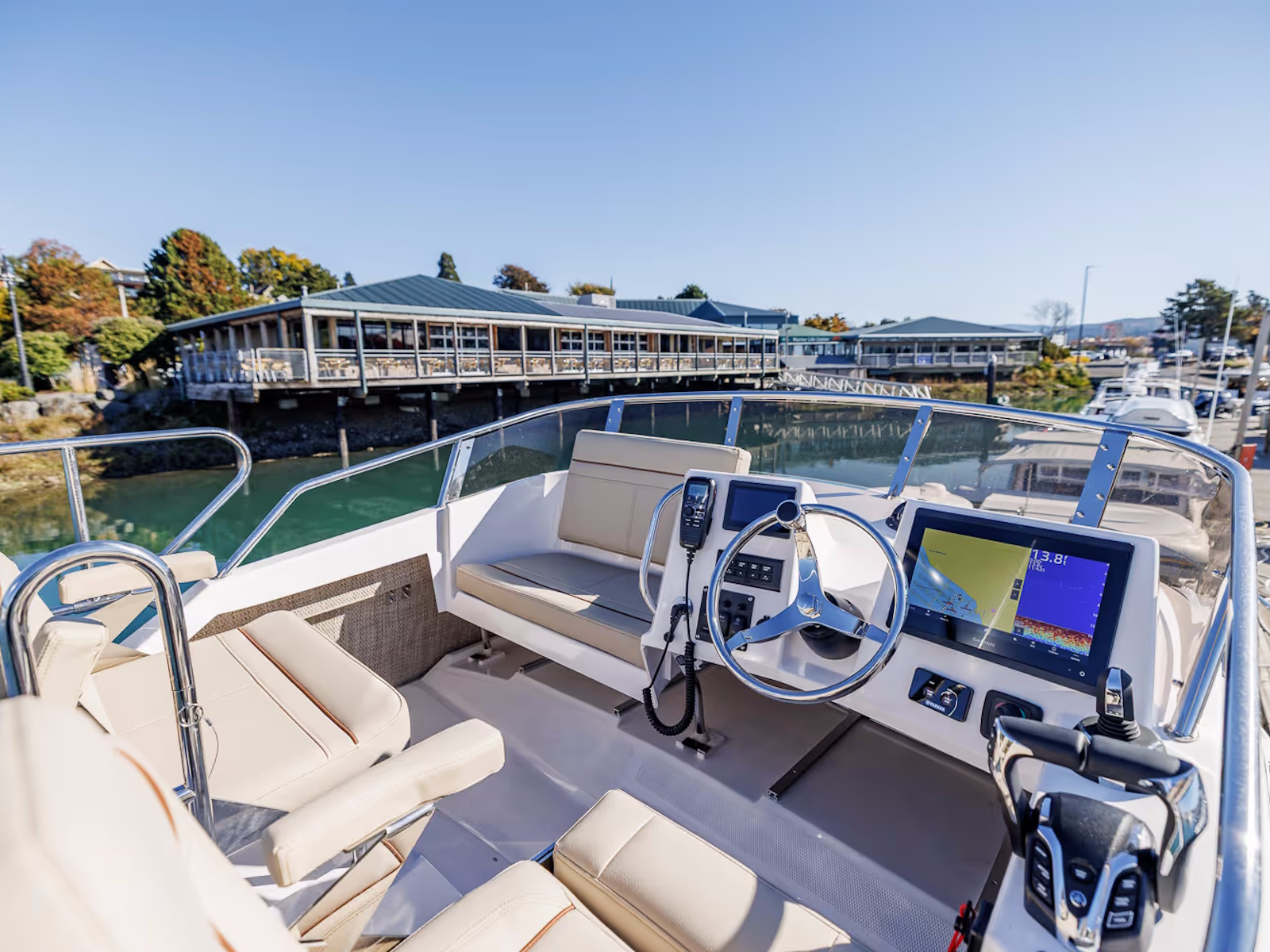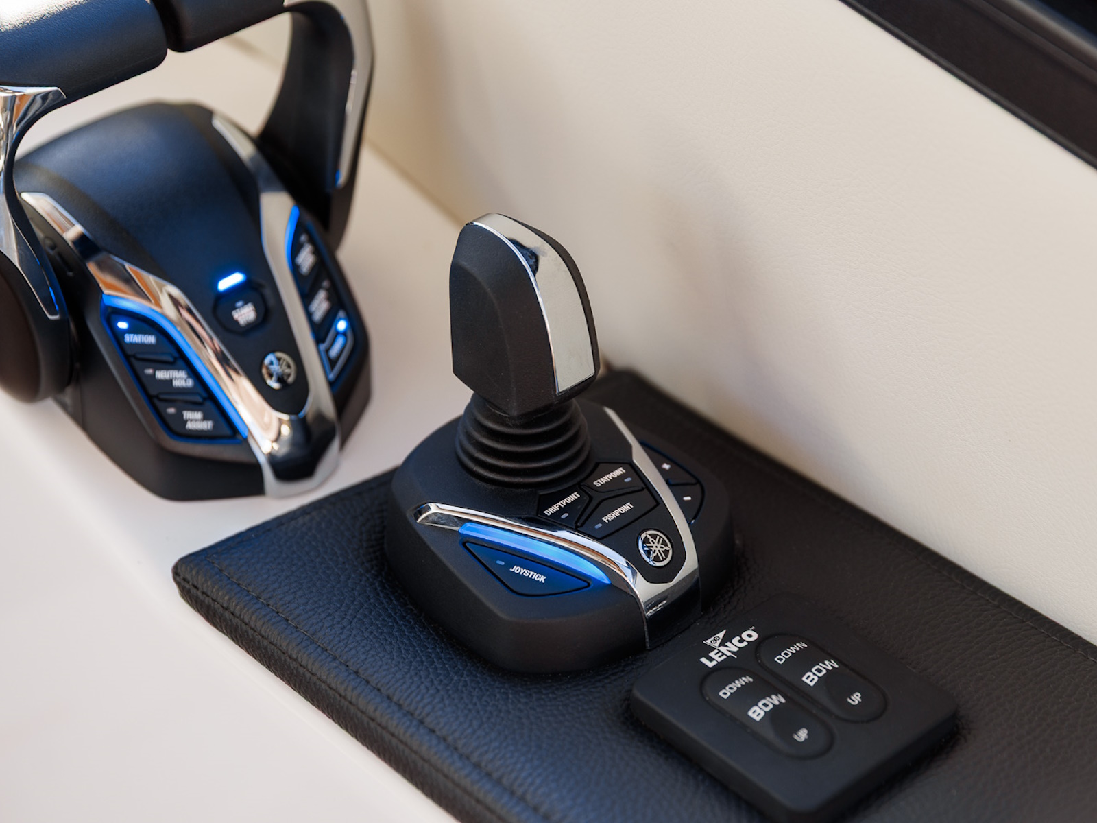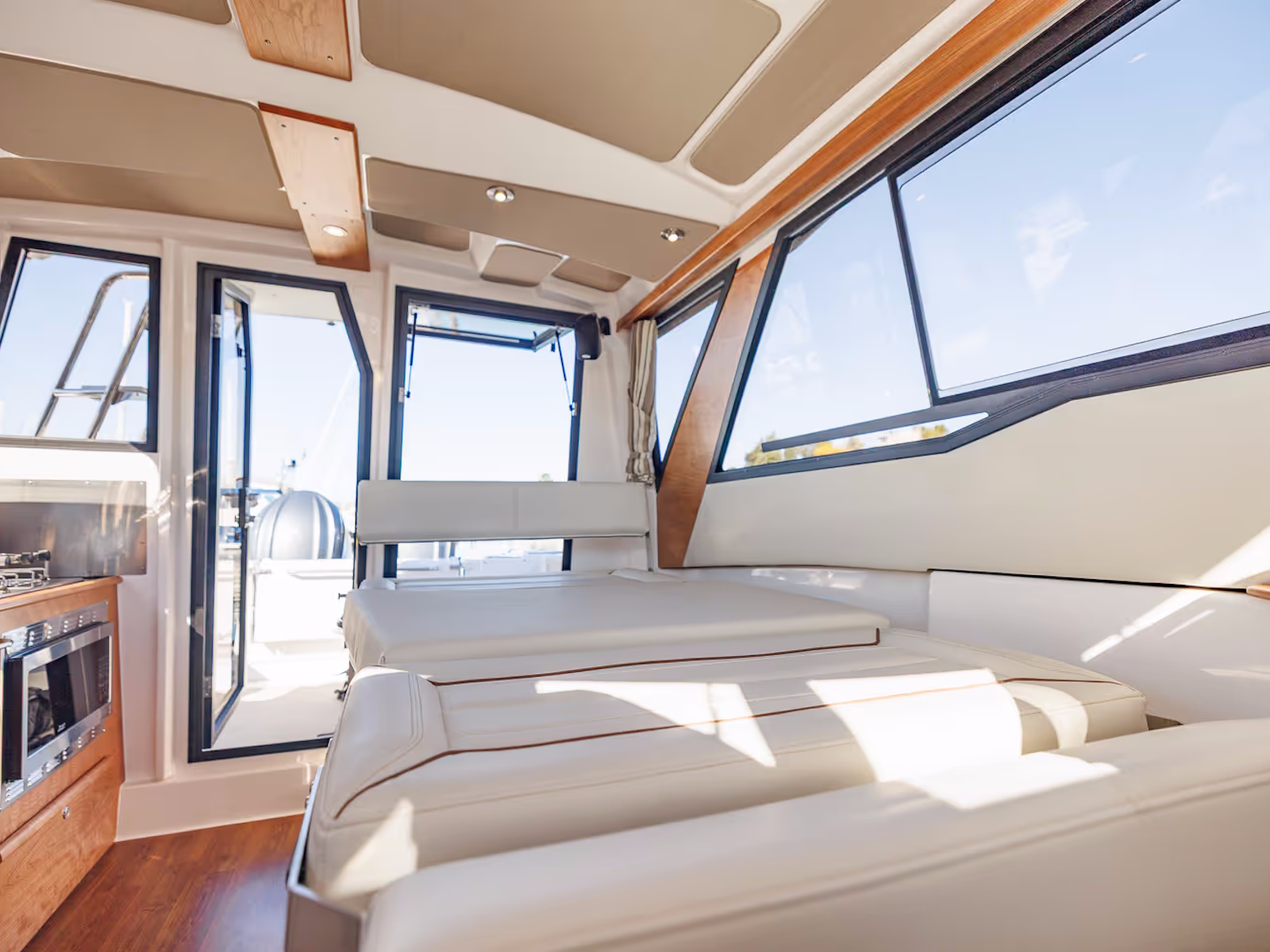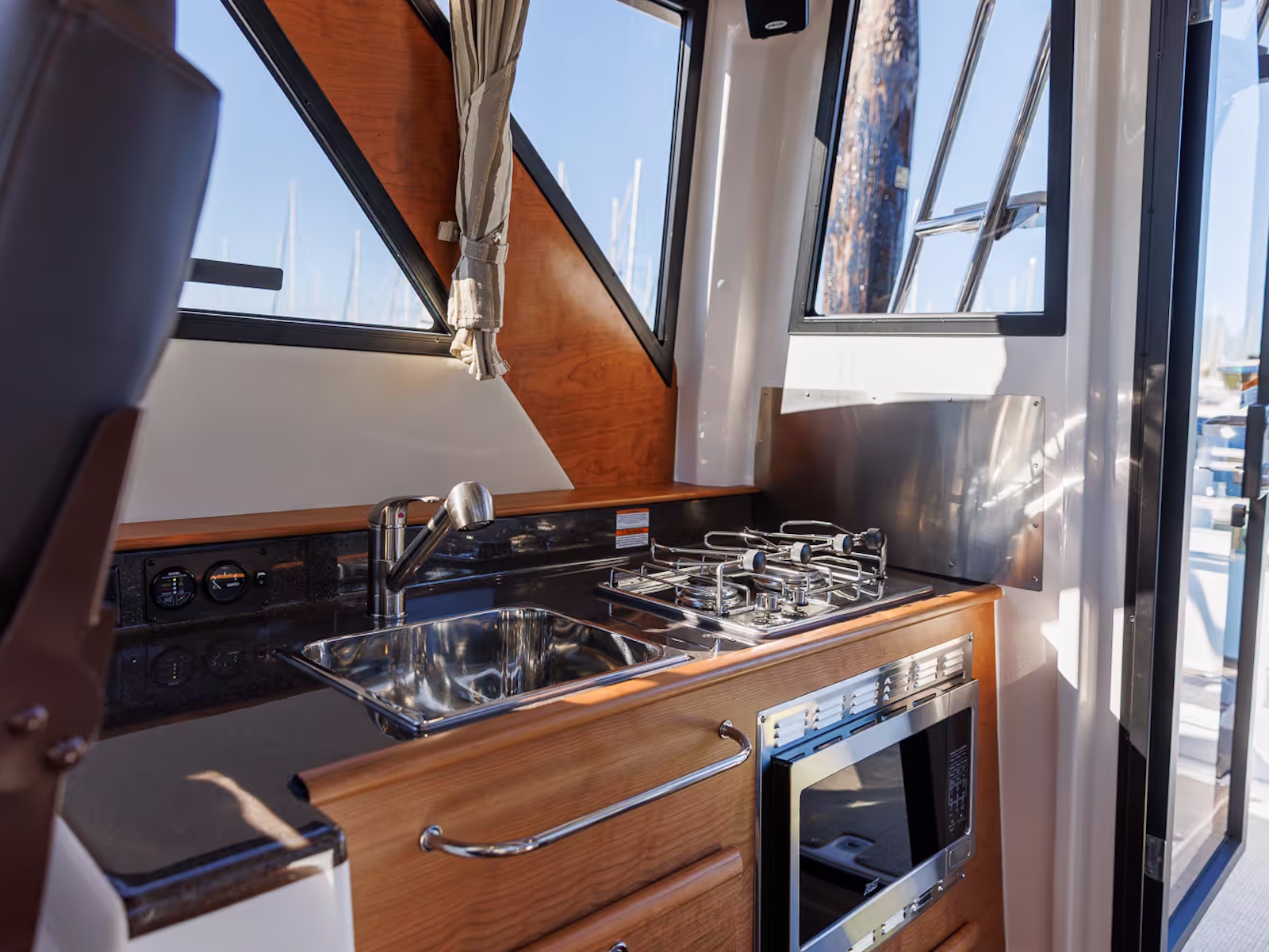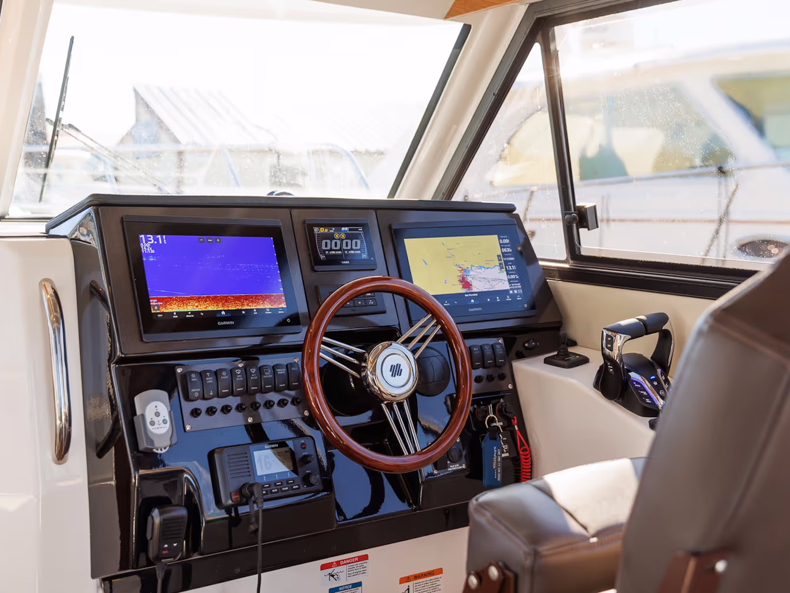 Step inside the salon and you’ll find your home on the water, with a full galley featuring a stovetop, stainless-steel sink with pull-out rinse faucet, fridge/freezer combo, microwave convection oven, cabinetry, and a wine/water cooler. The helm is a Captain’s dream with a Garmin chartplotter, autopilot, sonar, xHD radar, color engine displays and a twin-lever electronic throttle control.