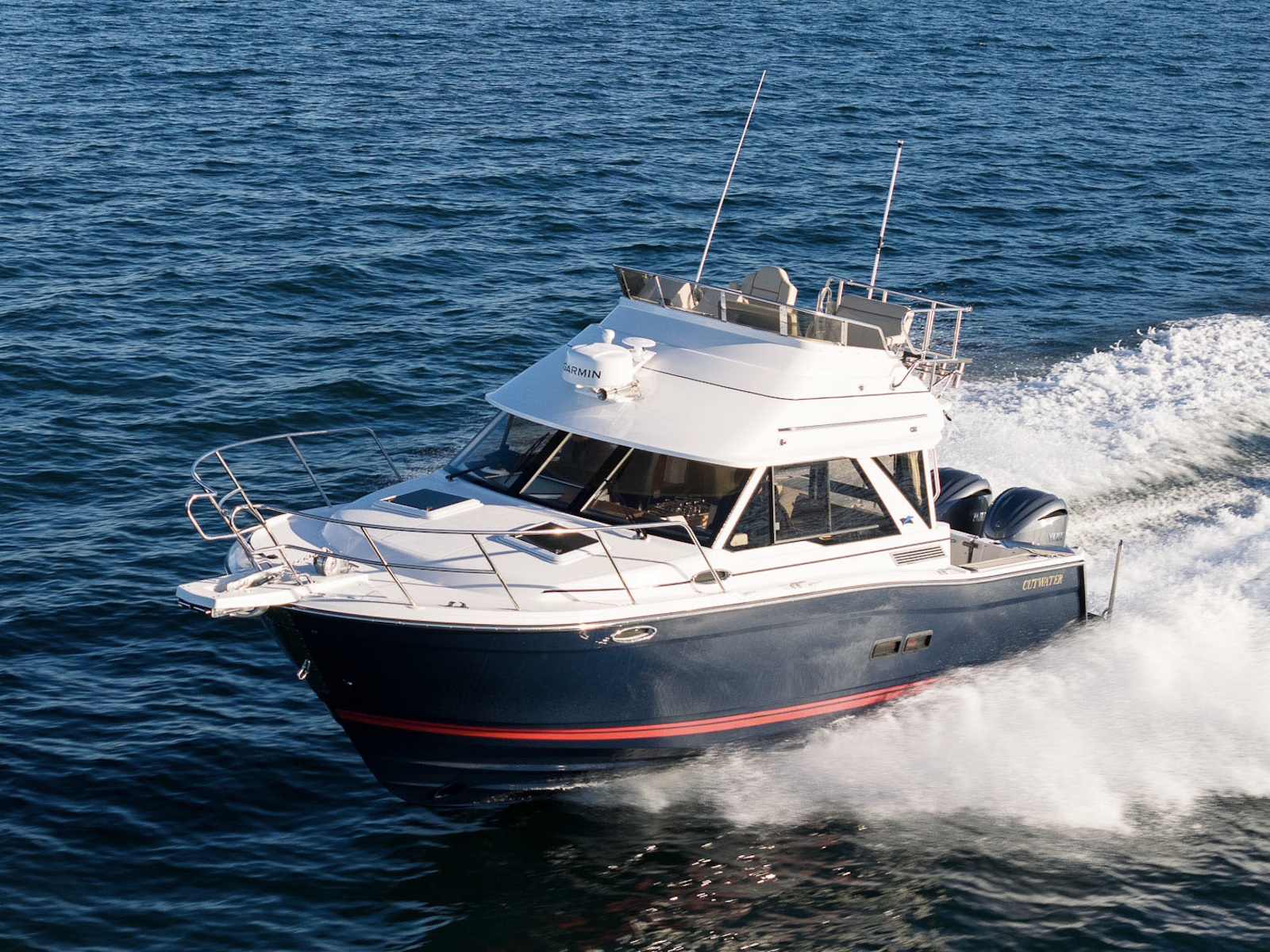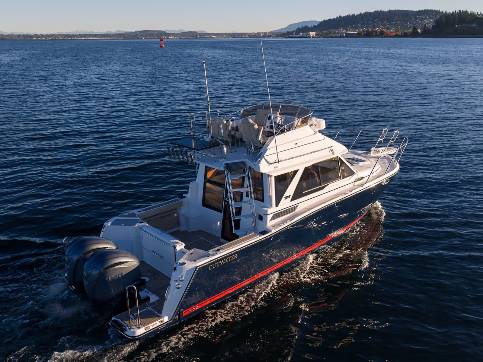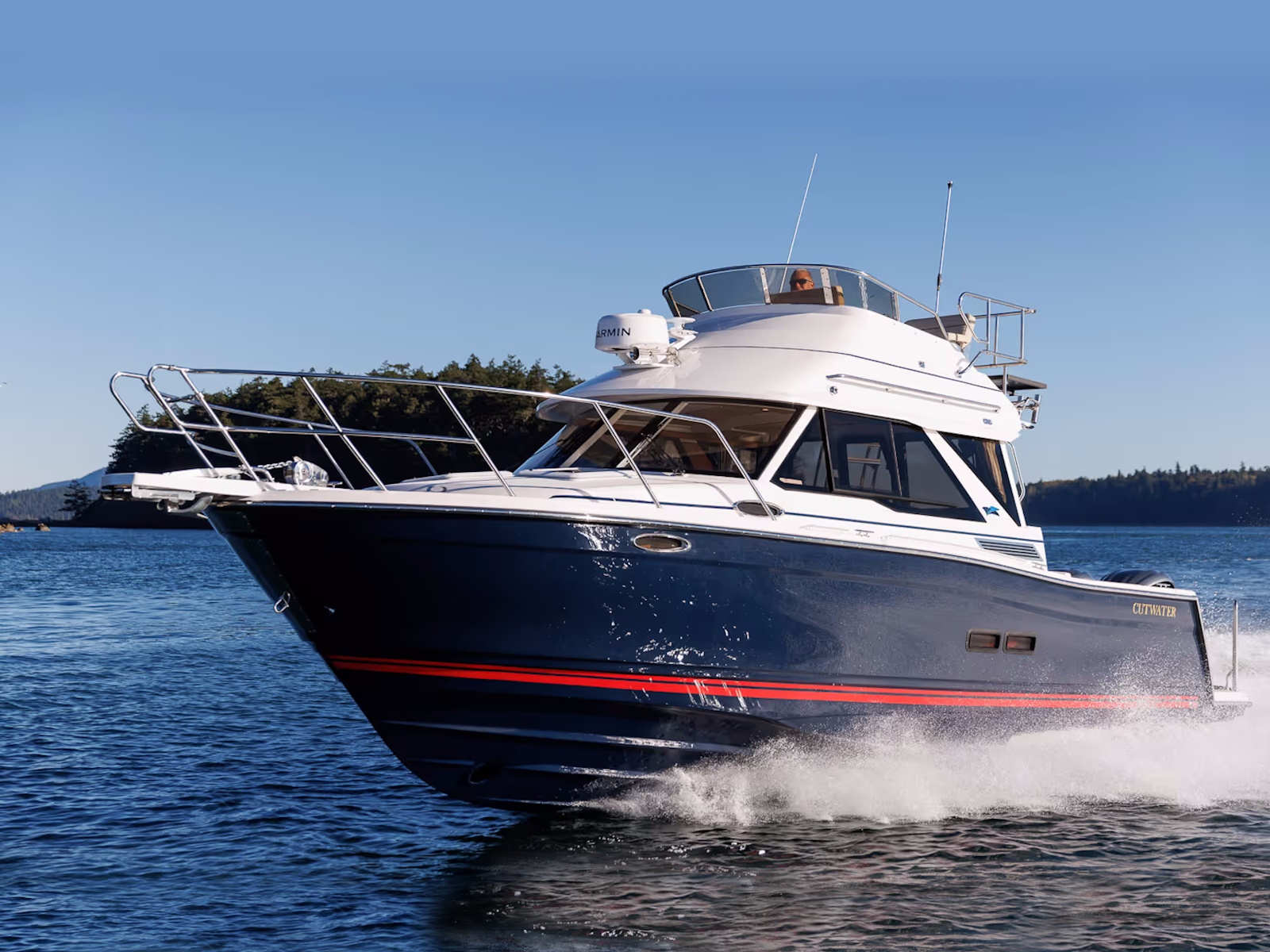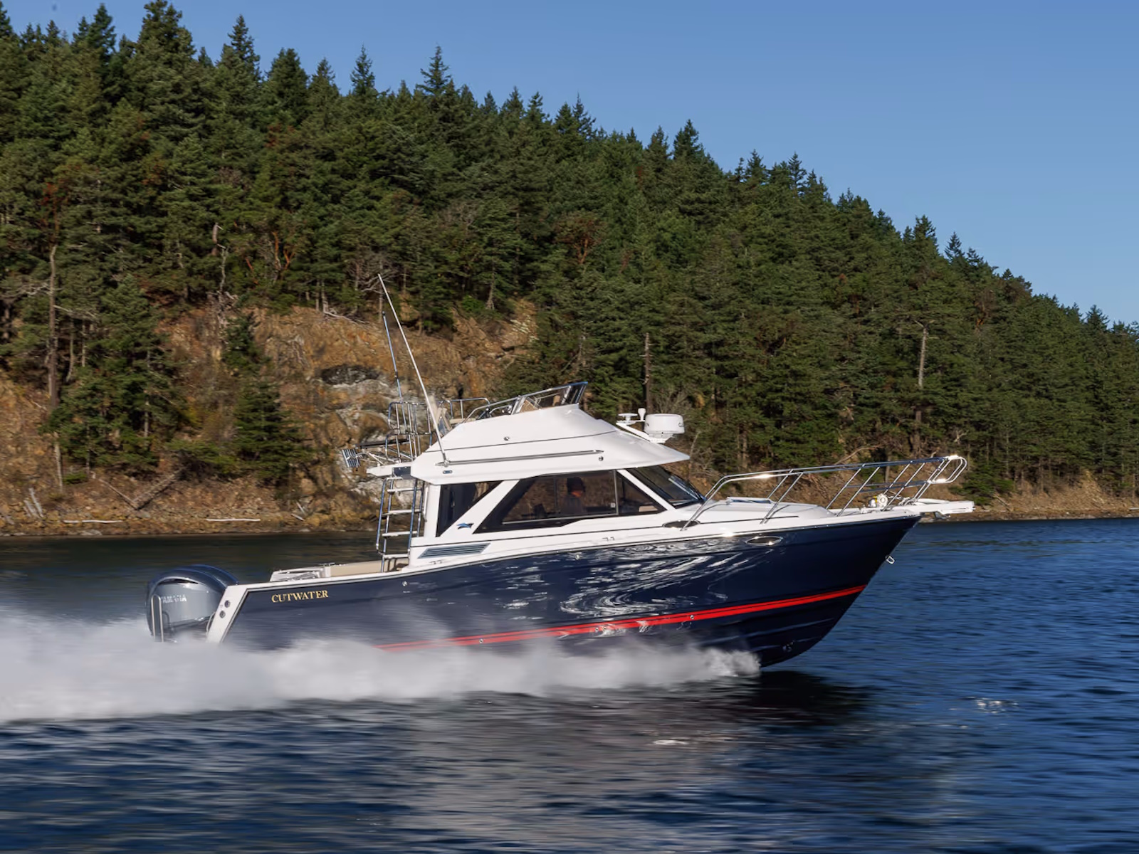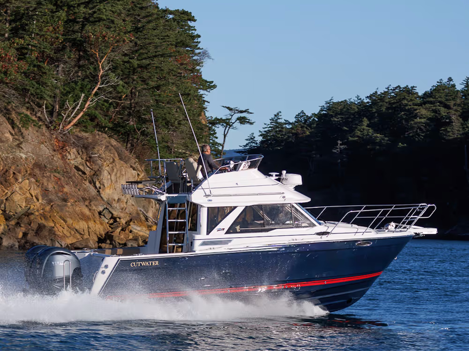 True to the Do-It-All nature of Cutwater Boats, the C-288 CB is loaded with premium features as standard equipment, providing unsurpassed versatility. The contemporary Downeast design is set to turn heads wherever she’ll roam, and avid cruisers will appreciate the abundant power produced by the twin counter-rotating Yamaha F250 outboards. The C-288’s advanced hull design delivers the perfect blend of performance, comfort and efficiency thanks to the double-stepped deep-V hull, Laminar Flow Interrupters and a stout 10’ beam. The generous beam maximizes cabin area and on-water stability while remaining trailerable.