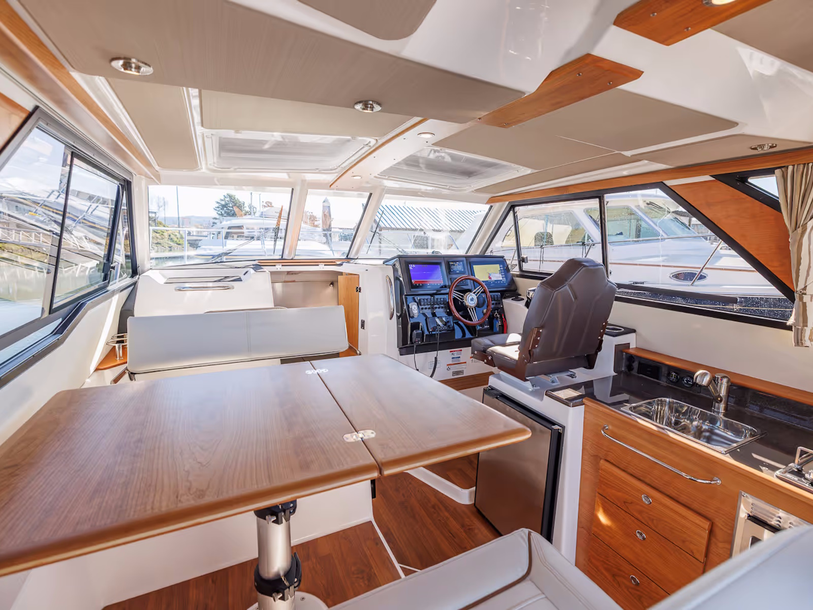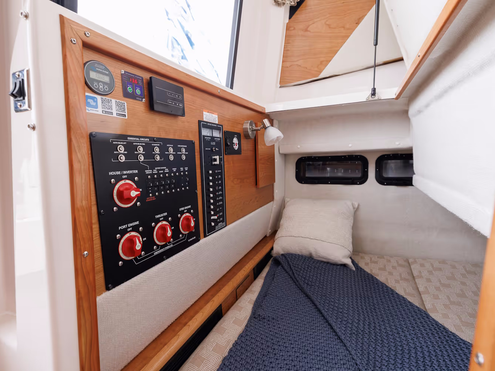 From the cockpit, the Secure-step ladder leads to the Command Bridge. Perched above the hardtopis a second helm station with full Garmin electronics suite, VHF, bow thruster controls, and comfortable seating for up to four guests. Whether underway or at anchor, the Command Bridge offers an elevated vantage point with panoramic views and a social atmosphere, making it the perfect place to navigate, relax, or enjoy a sunset cruise.