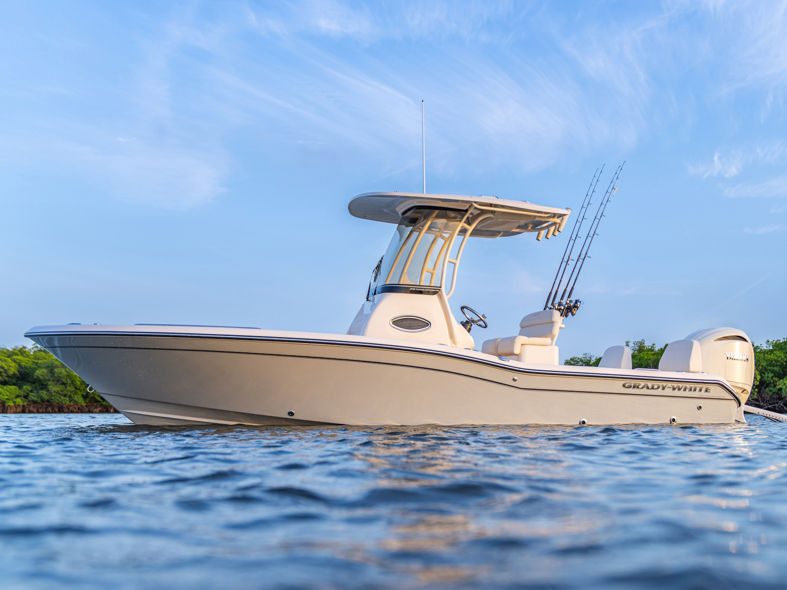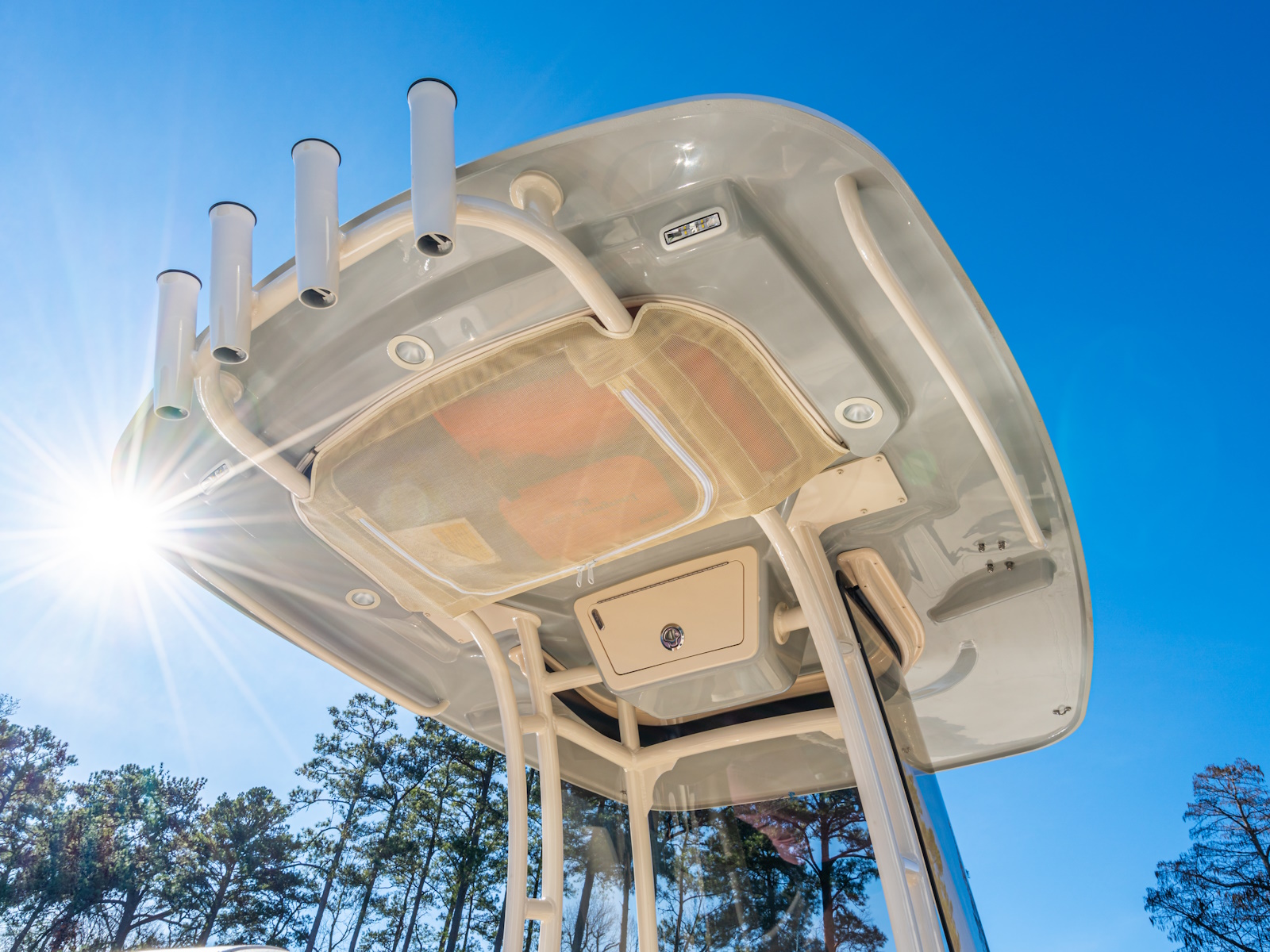 - T-top - fiberglass w/painted aluminum frame, storage net, LED spreader lights, rod holders (4), tri-colored (red, blue, white) LED recessed lights (3) & radar flat
