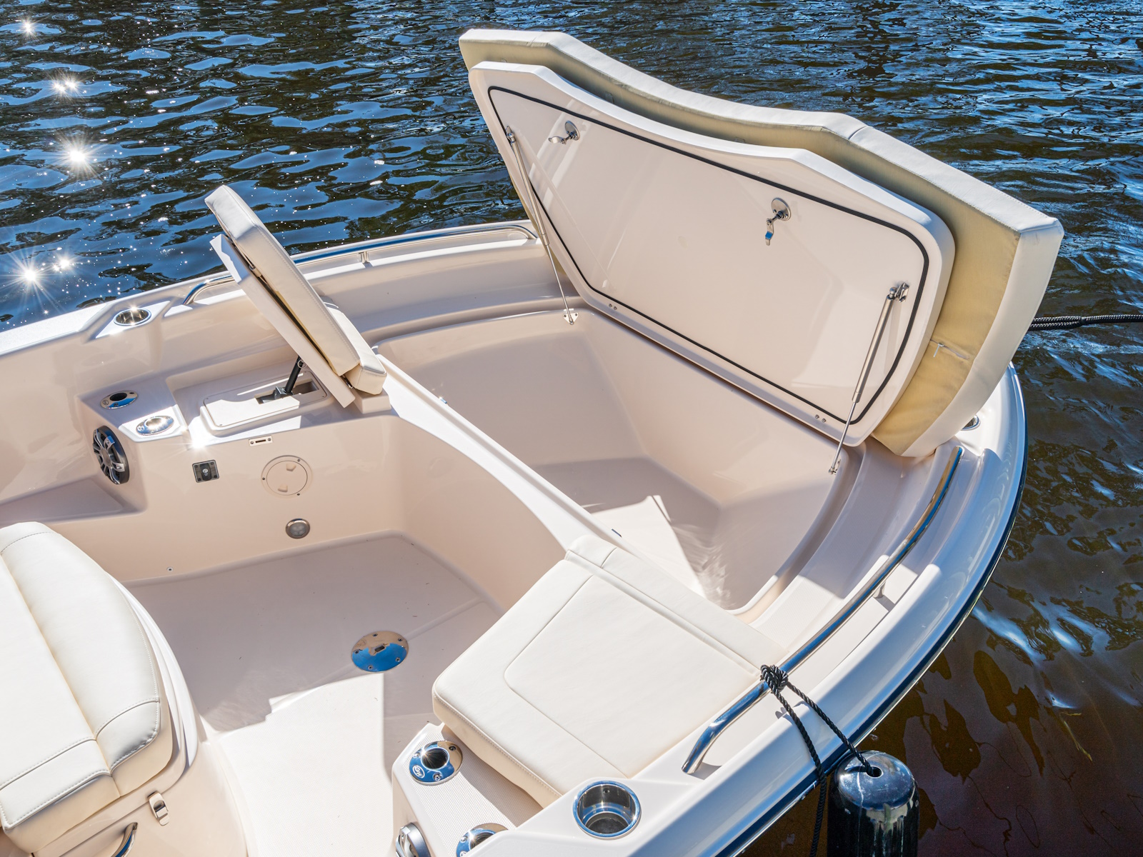 277-qt. (262.1 l) forward insulated fish box w/overboard drain | 29-qt. (27 l) insulated storage box under forward console seat