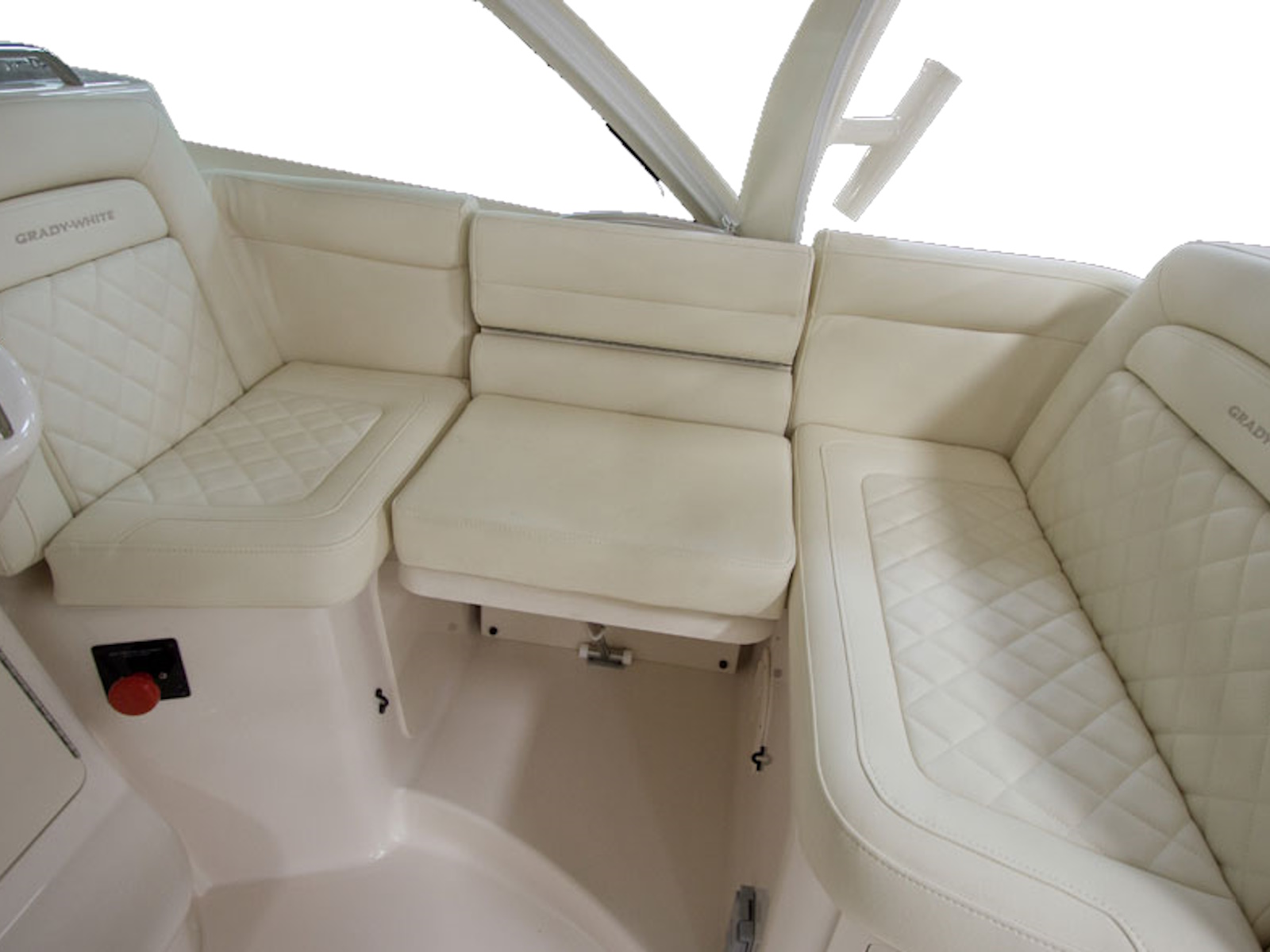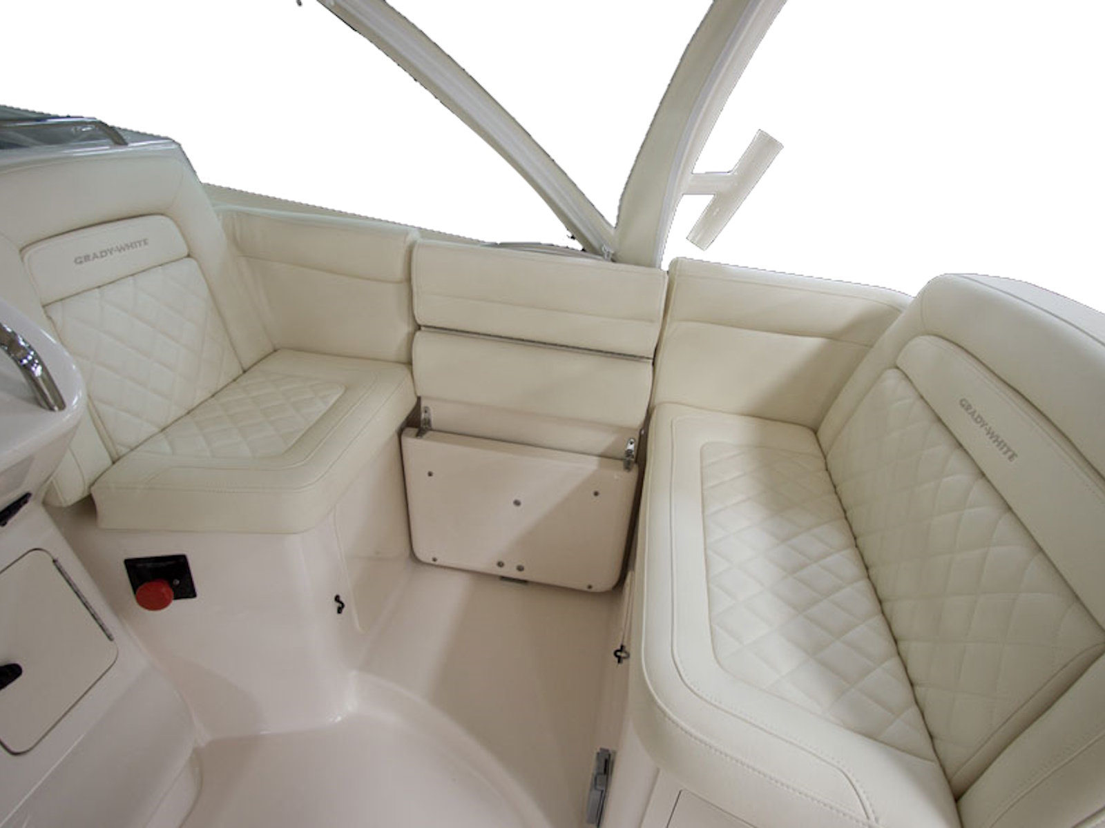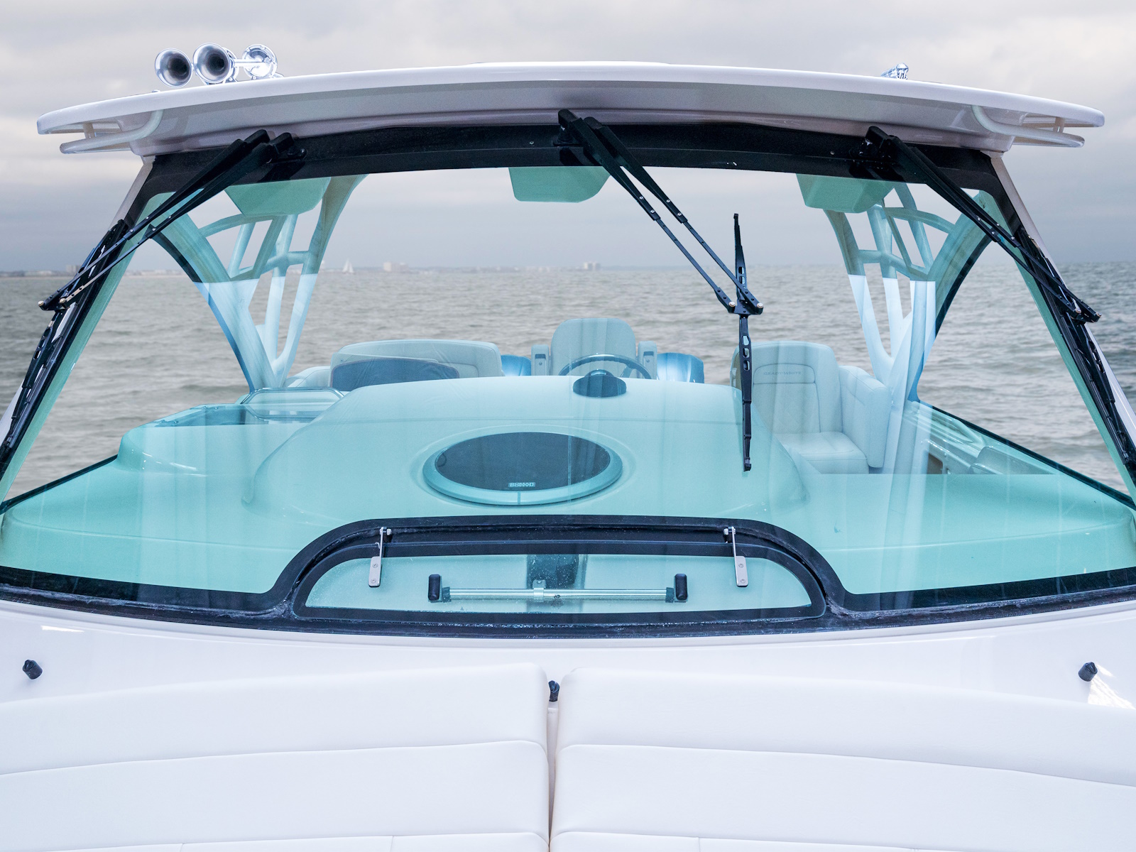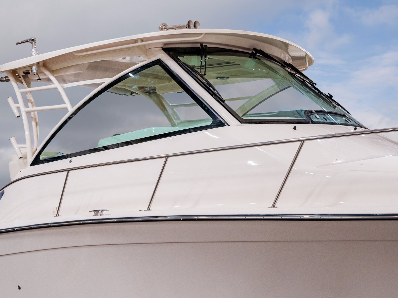 - Hardtop - AV²® enclosure w/painted aluminum frame, electromechanically sliding sunroof w/screen & shade, storage net, LED spreader lights, tri-colored (red, blue, white) LED recessed lights (8), storage compartments (2), side mounted rod holders (4), outrigger plates, SureShade® electrically retractable shade w/Sunbrella® canvas (oyster), Clear2Sea™ side curtains & drop curtains (ivory)