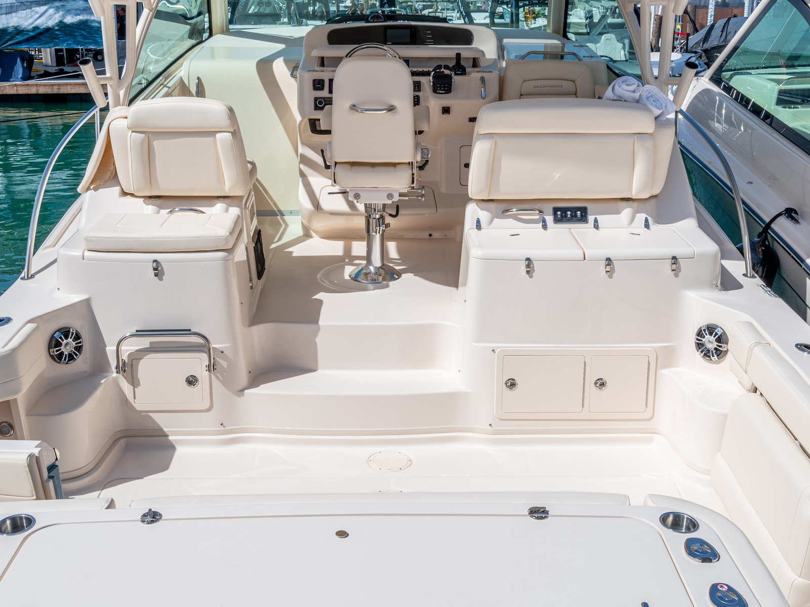 With custom yacht qualities, the Express 370, a 37-foot express cabin boat, offers more exceptional details, ample cabin room, performance, and reliability than many inboard boats that are larger in length! You will be amazed at the multitude of standard features on this best cabin cruiser boat. From the AV²® hardtop with electronically sliding sunroof, mass amounts of storage, the most comfortable seating options, and a grand cabin complete with galley to the convertible dinette area and enclosed head, no stone has been left unturned in the design of this boat. A favorite among Grady owners, the 370 is a luxurious family cruiser that’s equally well-suited for offshore saltwater sportfishing.