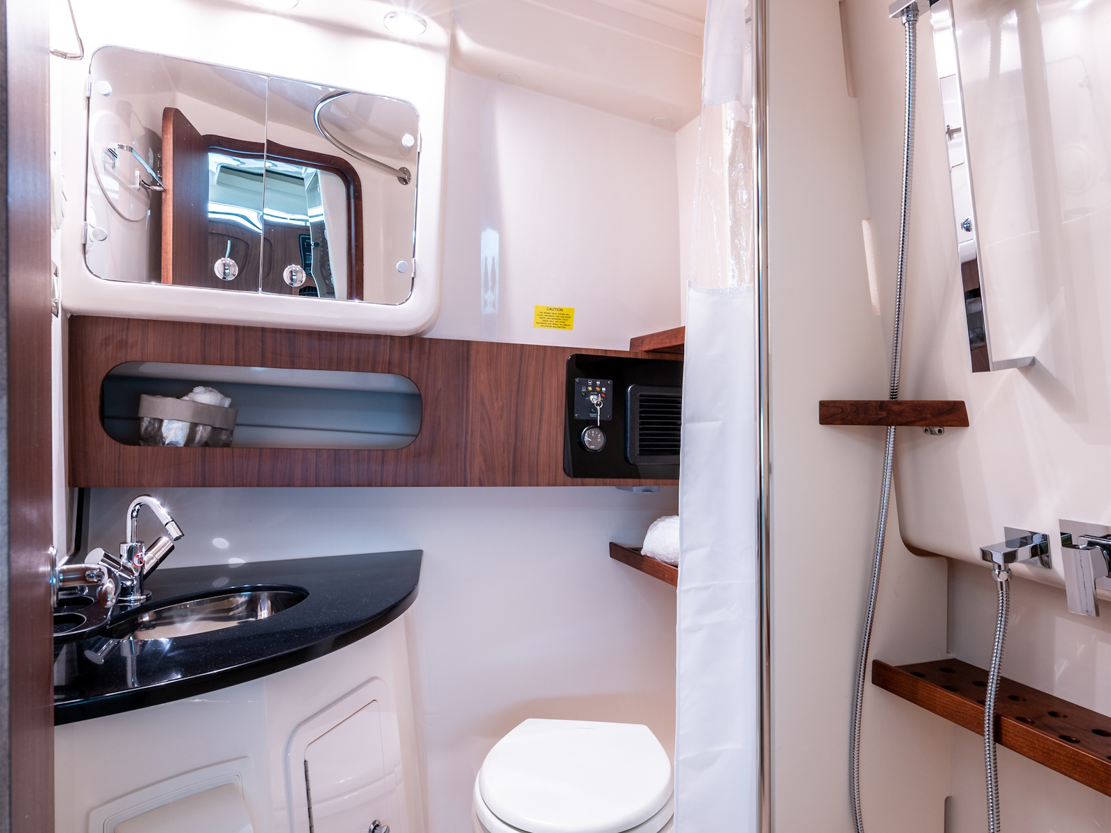 - Head - enclosed ventilated head area w/lighting, sink, Corian® counter top, shower w/teak shelf & grate, mirror, storage cabinet, cherry shelves (2) & VacuFlush® marine head w/freshwater supply, 18-gallon (68 l) holding tank, overboard discharge & deck pump out