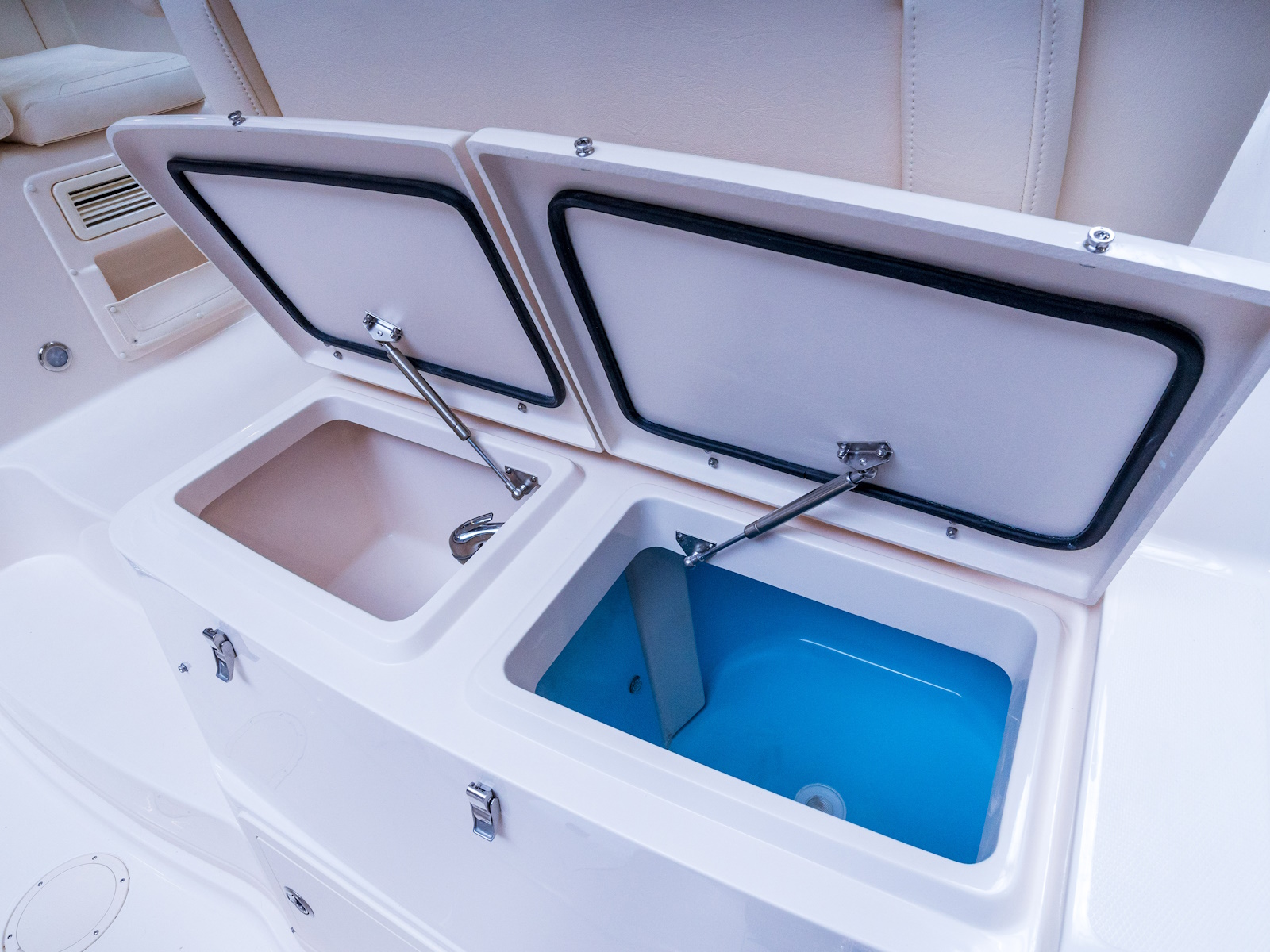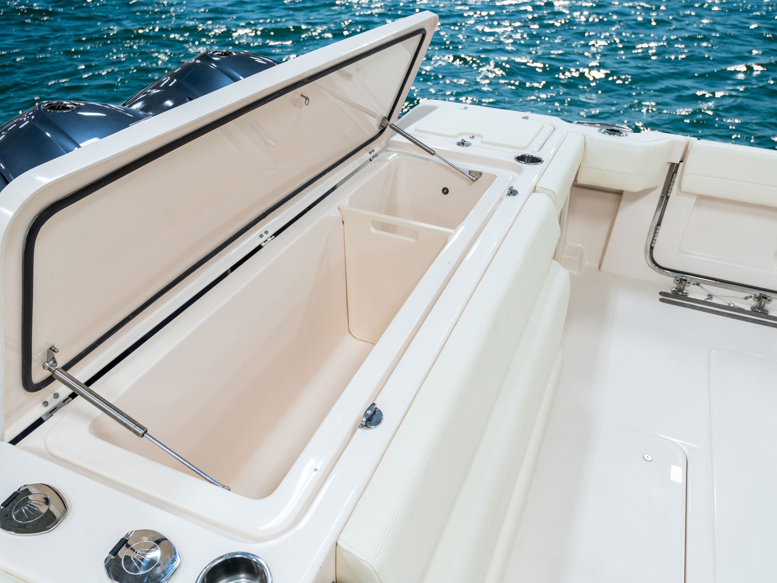 - Livewell - 48-gallon (181.7 l) starboard insulated raw water livewell w/light, full column distribution inlet & ob drain (1100 GPH pump) (4164 LPH)