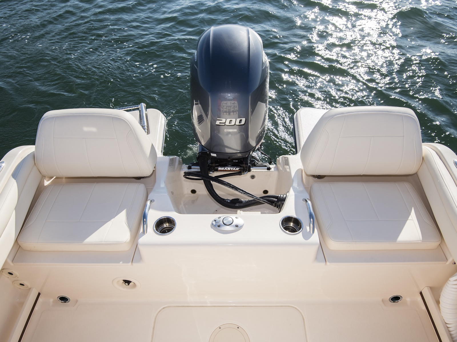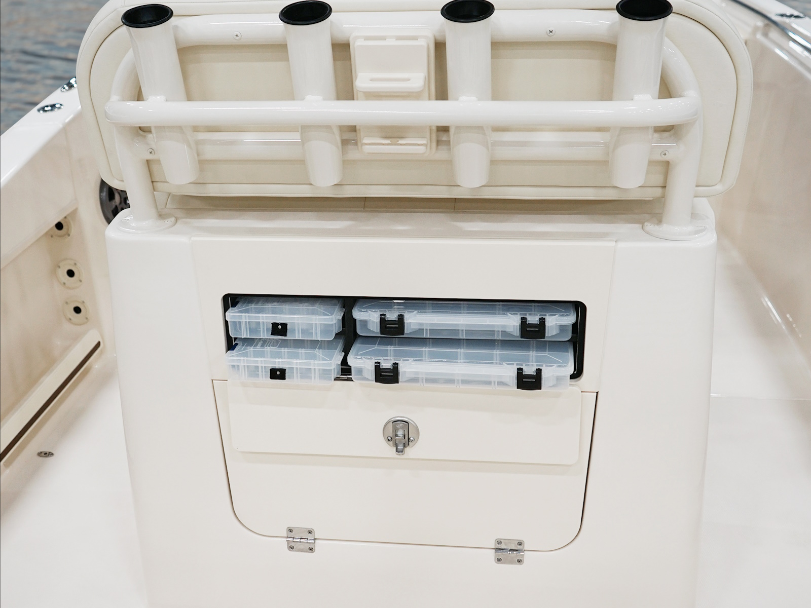 - Seating - Deluxe lean bar w/backrest, lockable storage, rod holders (4), 25-gal. (95 L) insulated raw water livewell (under seat) w/light, full column distribution inlet & ob drain (800 GPH pump) (3028 LPH)