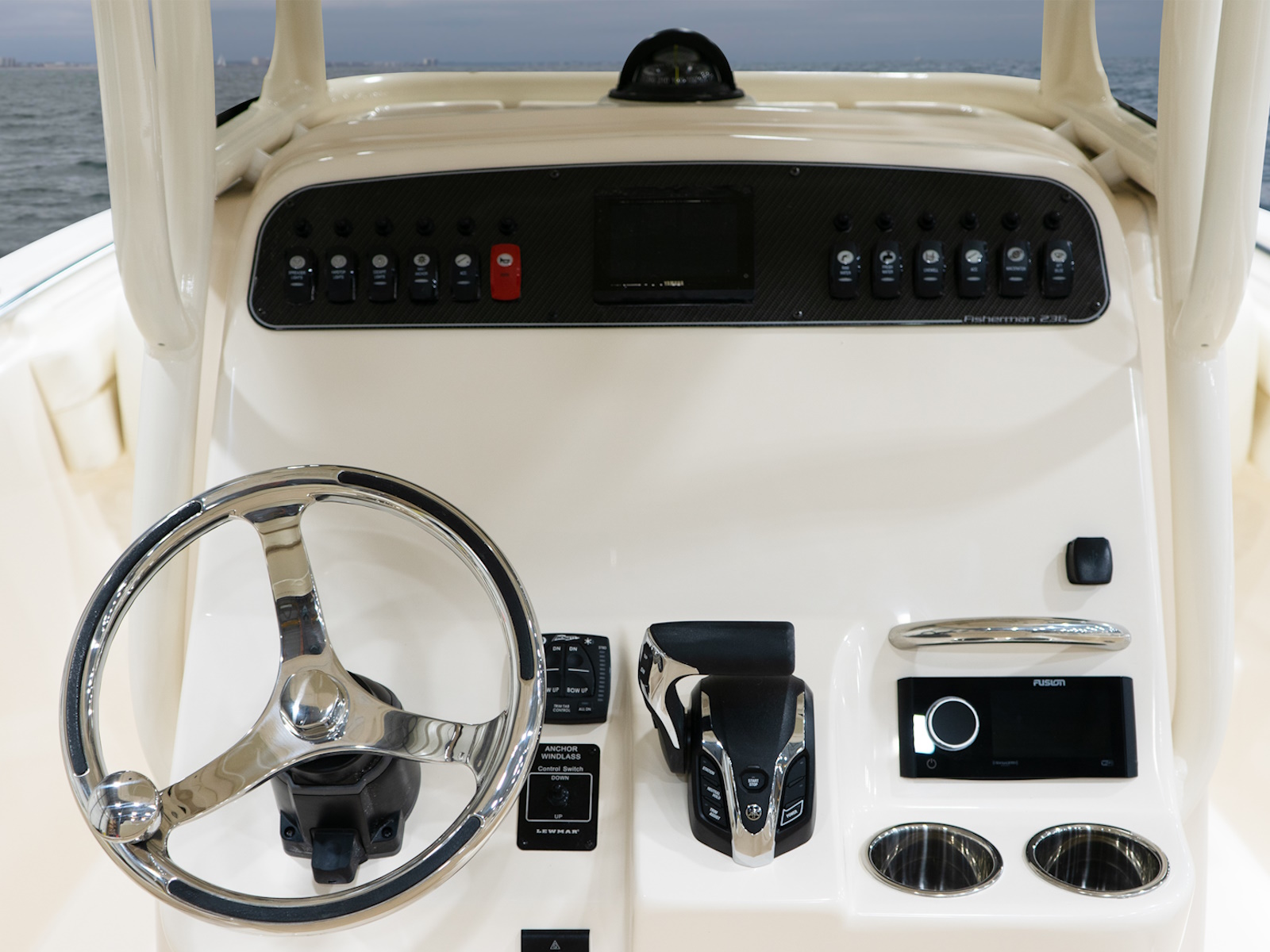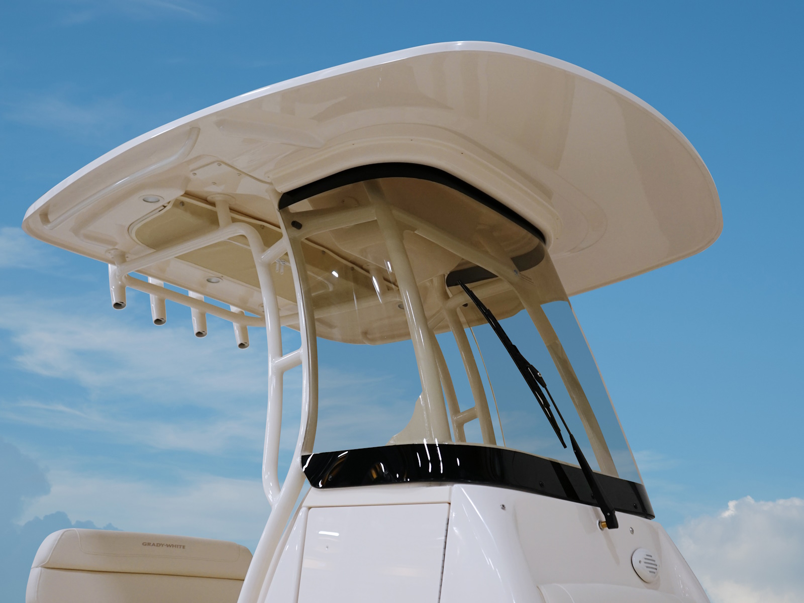 - T-top - fiberglass w/painted aluminum frame, storage net, LED spreader lights, rod holders (4), tri-colored (red, blue, white) LED recessed lights (3) & radar flat