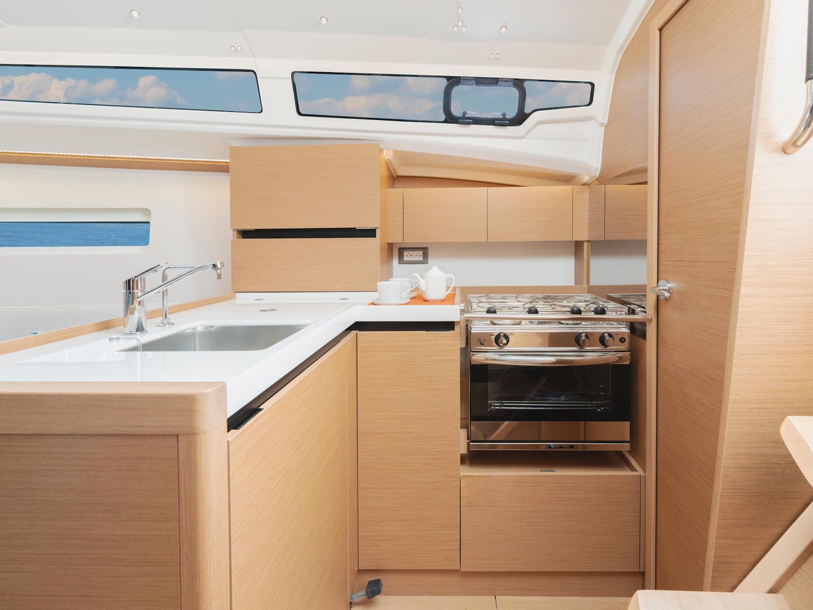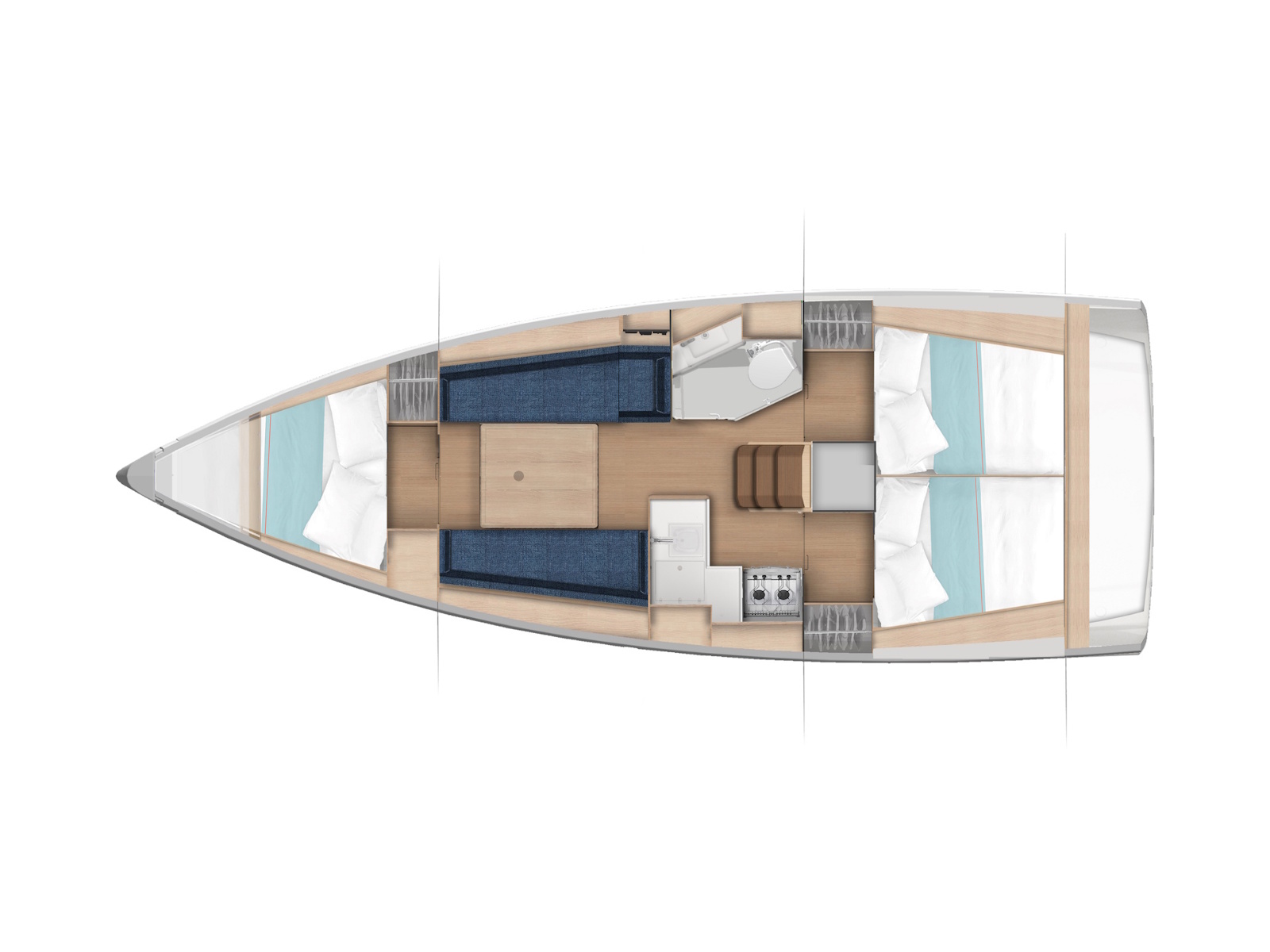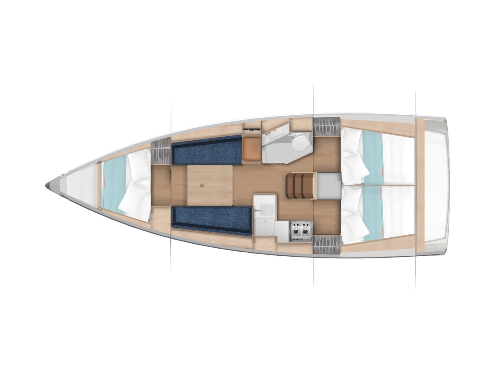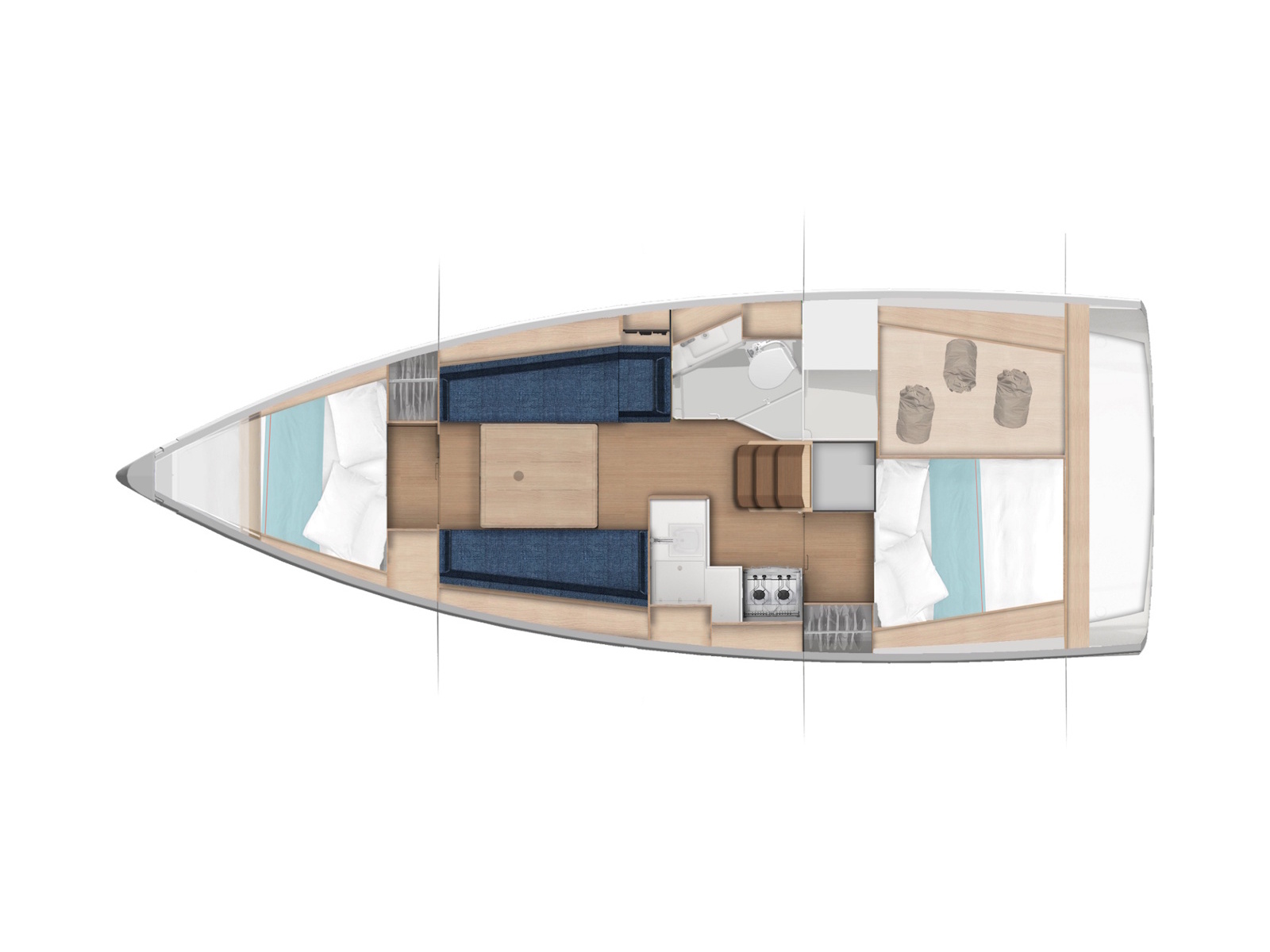 For superb cruises with family, this sailboat features a welcoming saloon with a contemporary design. Interior living spaces are bathed in light, streaming through wide windows in the hull and coachroof. In the evening, indirect lighting contributes to a warm, serene atmosphere on board. With standing headroom of over 1.85 metres throughout, the saloon and cabins feel spacious and inviting. Aboard the Sun Odyssey 350, pursue your passion for the sea and sea spray with greater well-being and peace of mind.