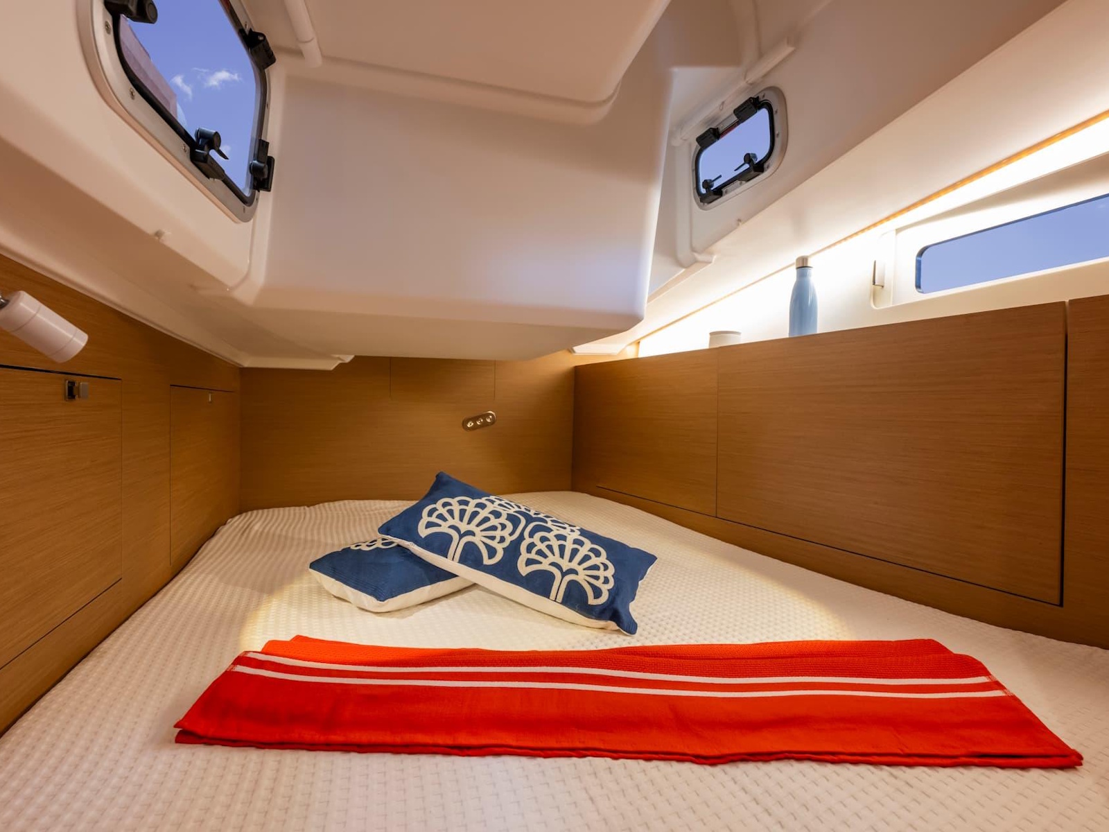 The spacious salon comfortably seats five, with plenty of natural light pouring in through large hull windows. Under-seat storage is easily accessible and thoughtfully designed to keep gear organized and out of the way.