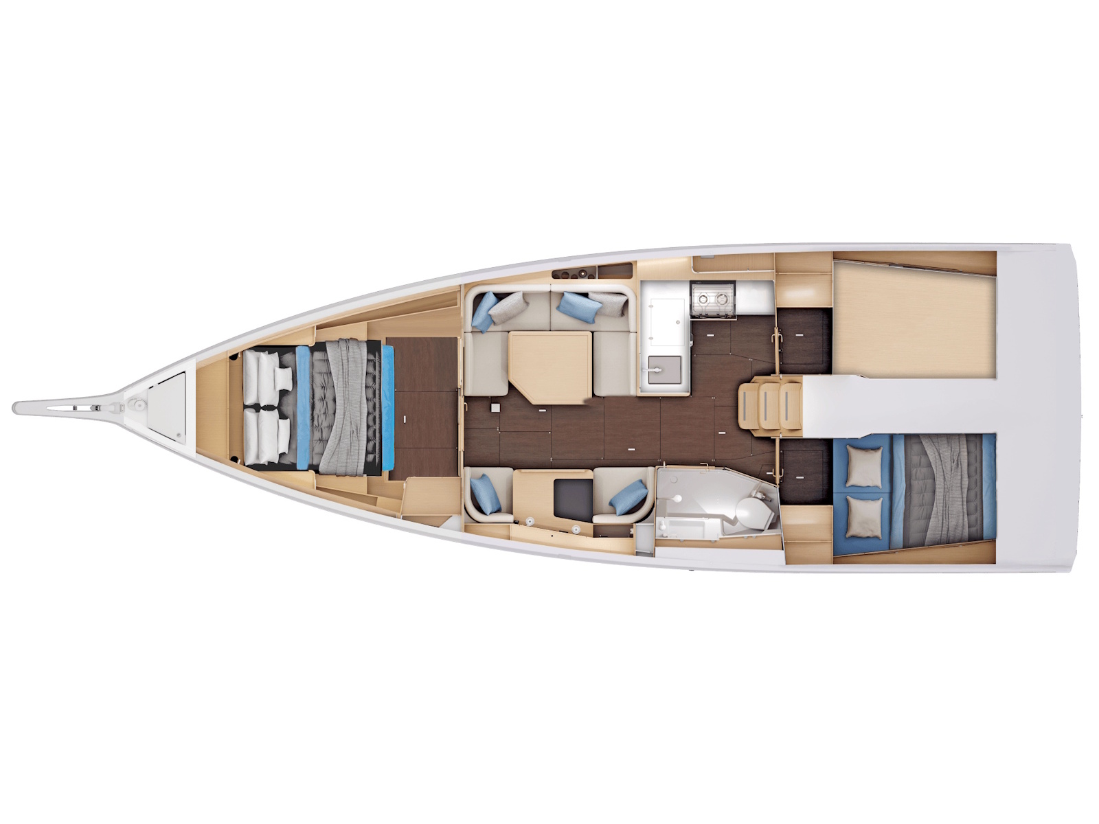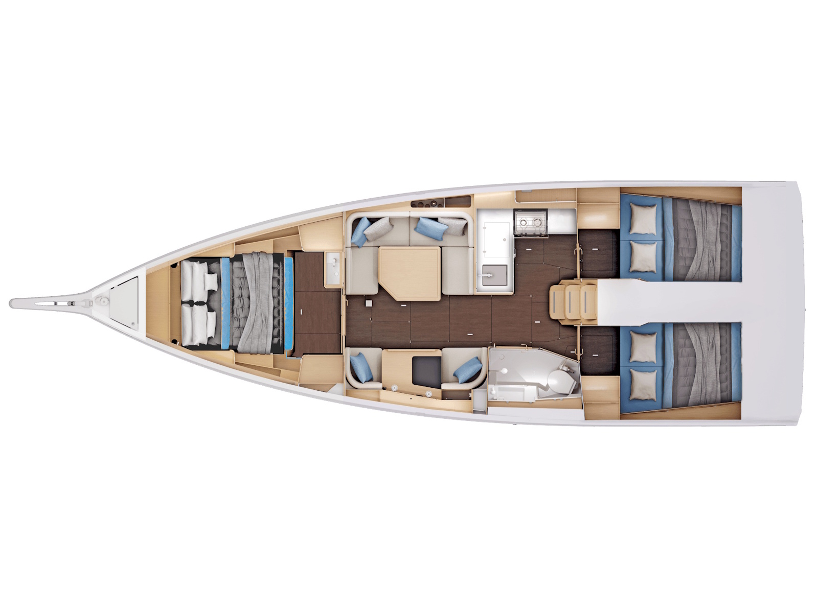 On starboard, a forward-facing nav station for two brings together all key systems in one intuitive space—complete with storage and a built-in bookshelf.