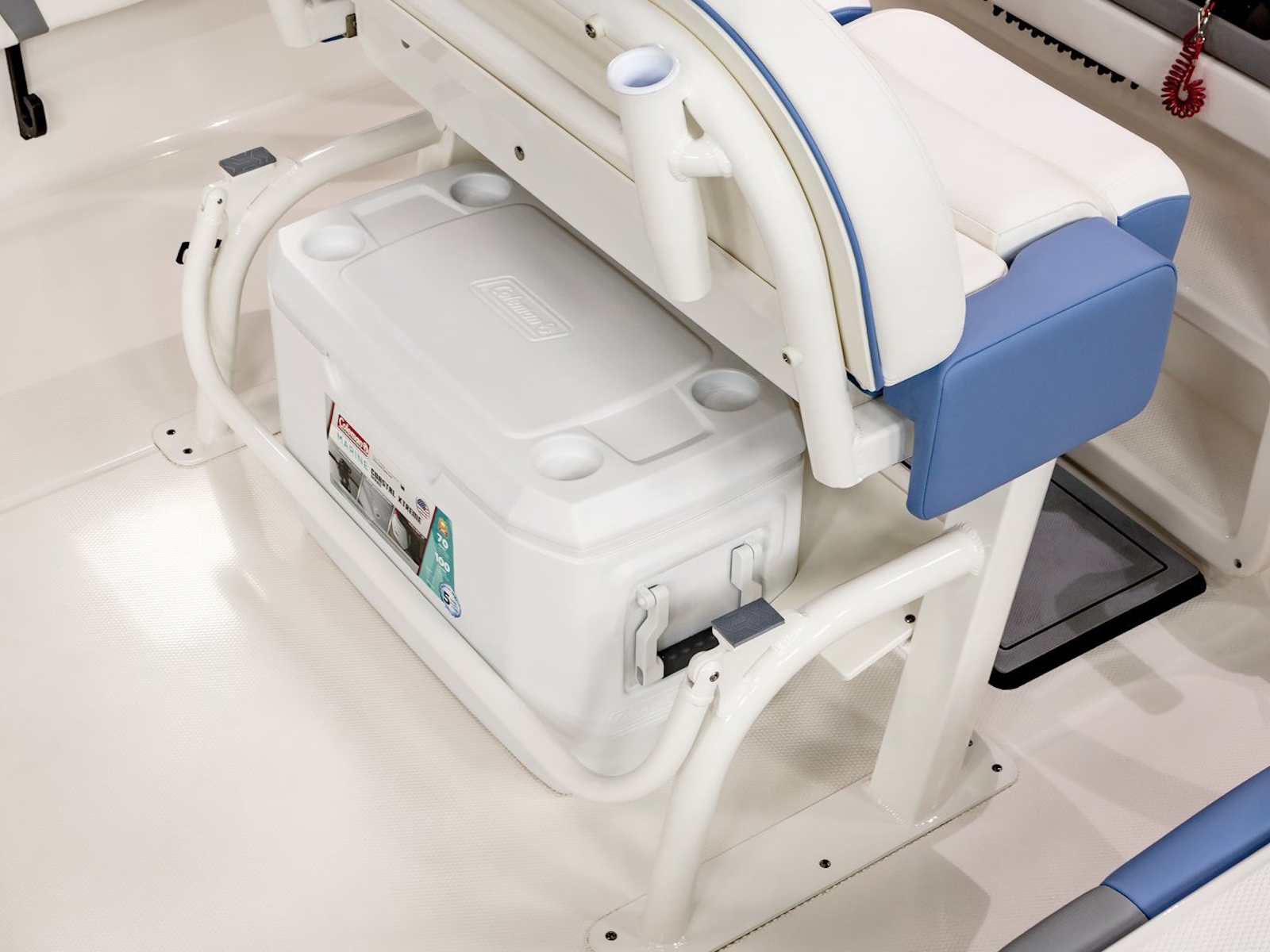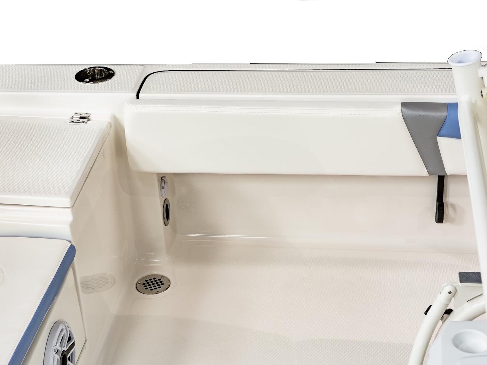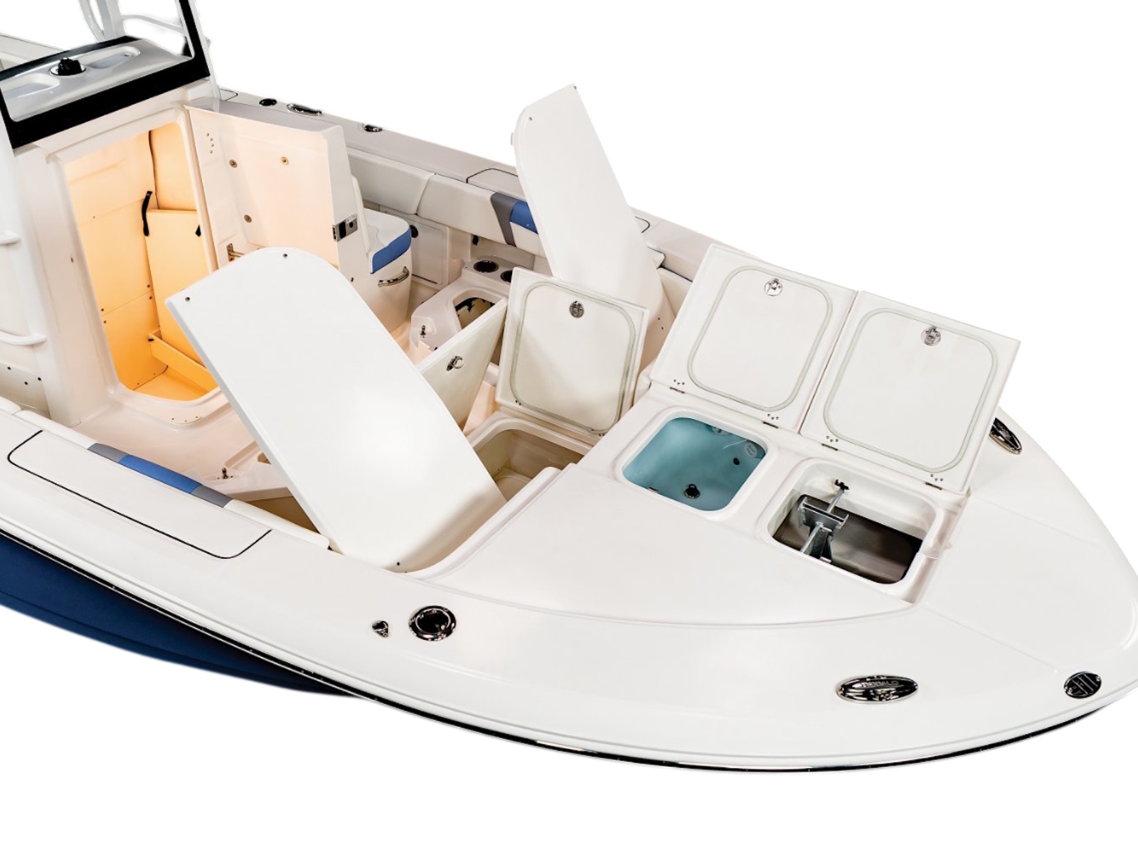 • Bow Center Insulated Livewell (20 gallons) with Dedicated Livewell Pump, LED lighting, Blue Gelcoat Finish with Adjustable Flow Valve