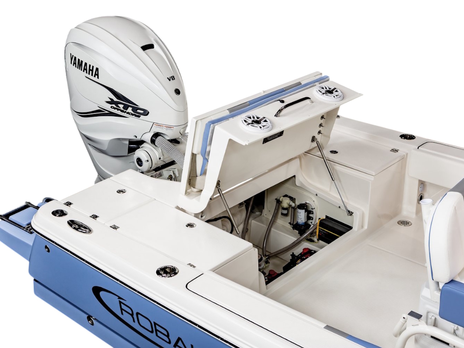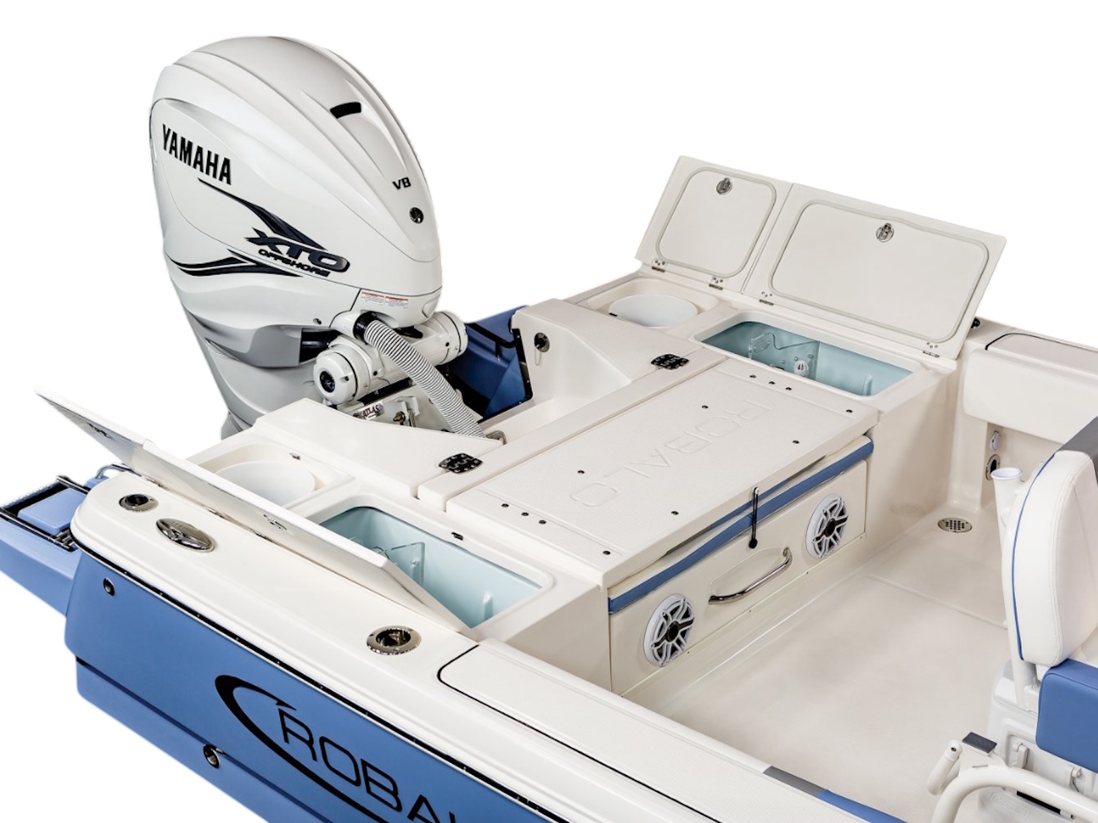 • Twin Aft Livewell/Fish Boxes (Insulated) (30 gallon) with Dedicated Livewell Pumps, LED lighting, Blue gelcoat Finish, Adjustable Flow Valve and Plexiglass Divider