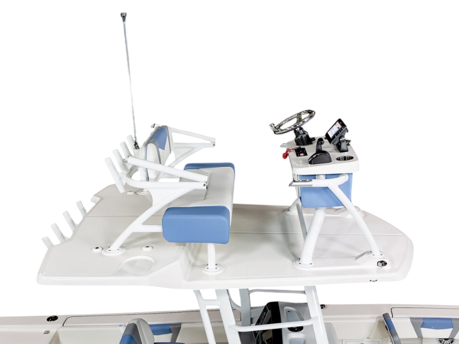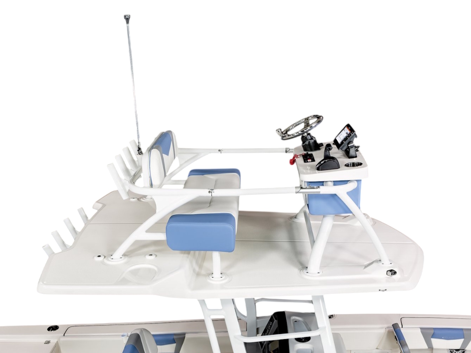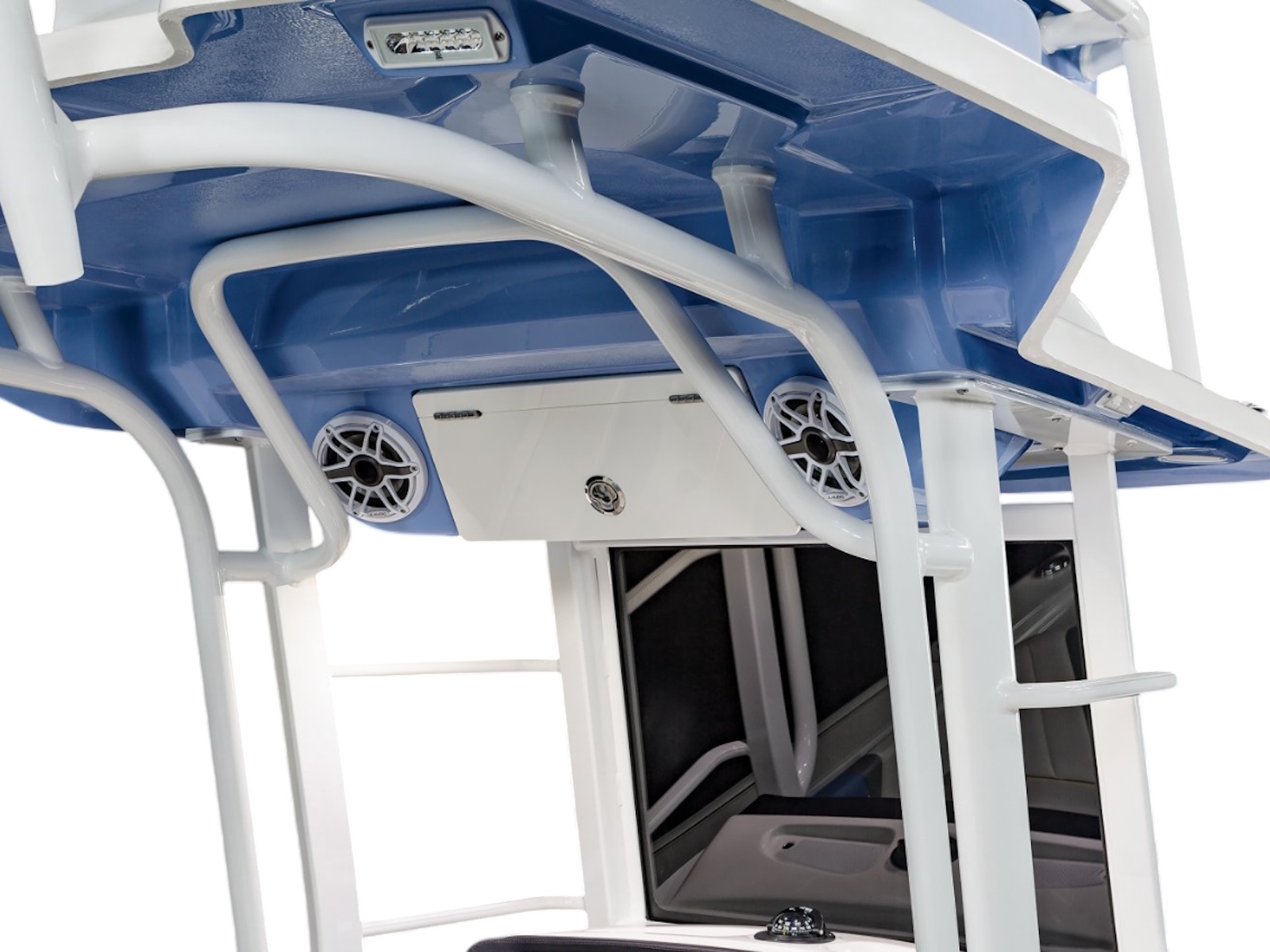 • Fiberglass Hardtop with Custom Powder Coated Frame (Black or White) Includes: Electronics Box, Two Tri Color Map Lights (White Dimmable, Red, And Blue), Spreader Lights with Dual Color (White and Blue Dimmable)