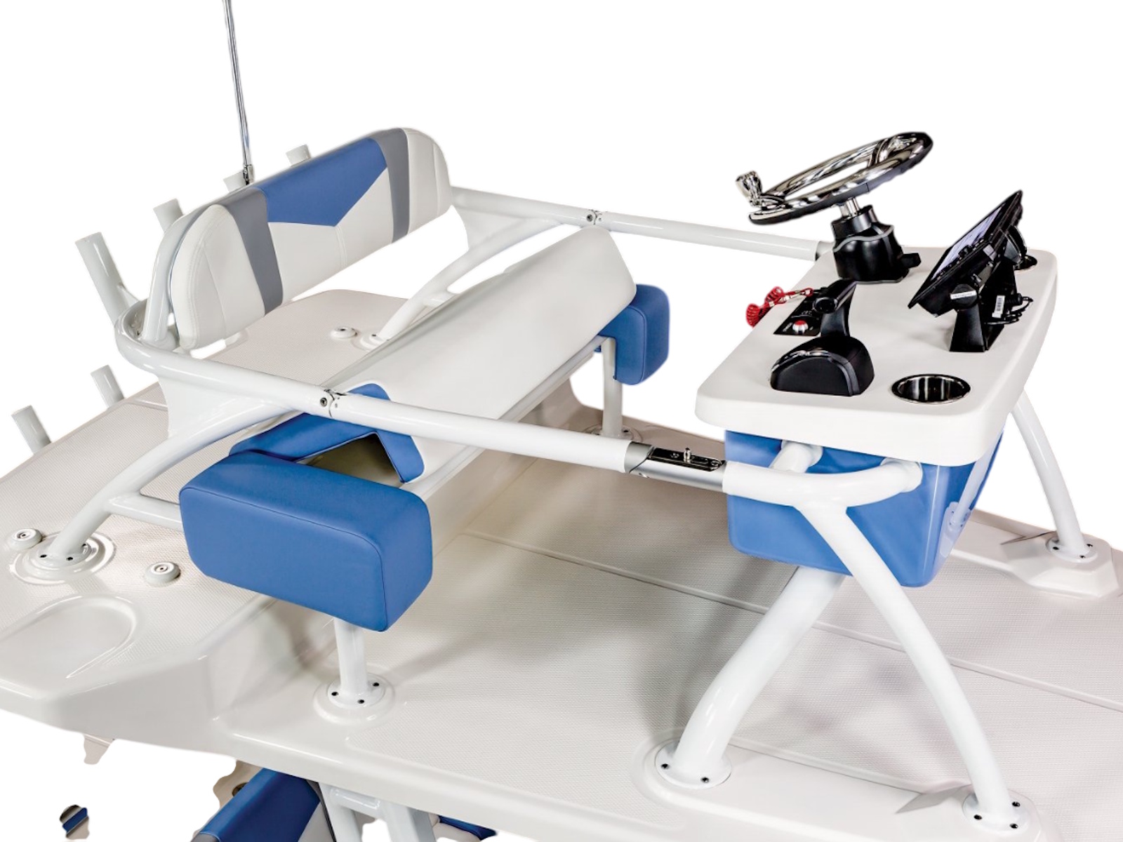 • Leaning Post with Dual Flip Up Bolsters, Backrest, Rod Holders (4), and 50 Liter Cooler (White or Black Powdercoated)