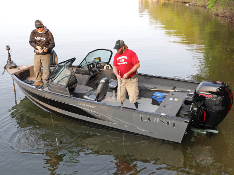The 1875 Lund Impact is sure to deliver the ultimate aluminum fishing boat experience. This boat is over 18’ long and comes with a full windshield or side console model. The 1875 Impact is loaded with fishing features such as two livewells, center and side rod storage, large casting decks and a rear flip seat option. Be it musky (muskie), walleye, crappie, or bass, this boat is one of the best aluminum boats around.